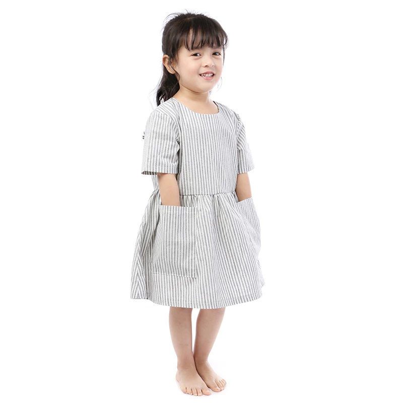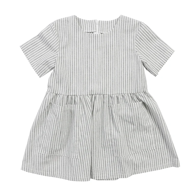 Wholesale Children Boutique Clothing Baby Linen Clothing Girls Stripe Linen Short Sleeve Summer Dresses with Pockets