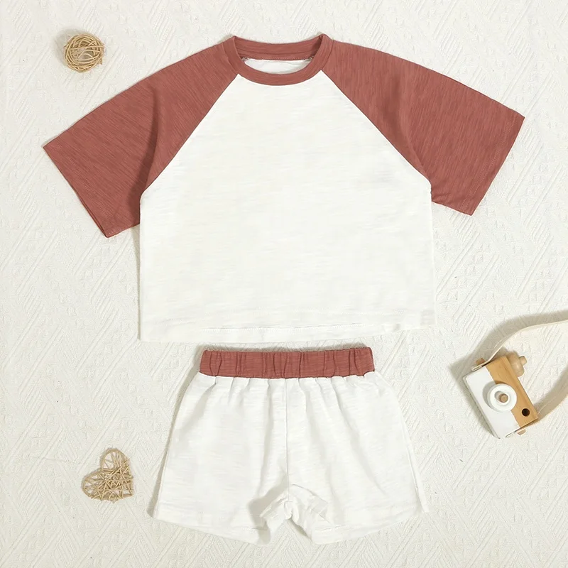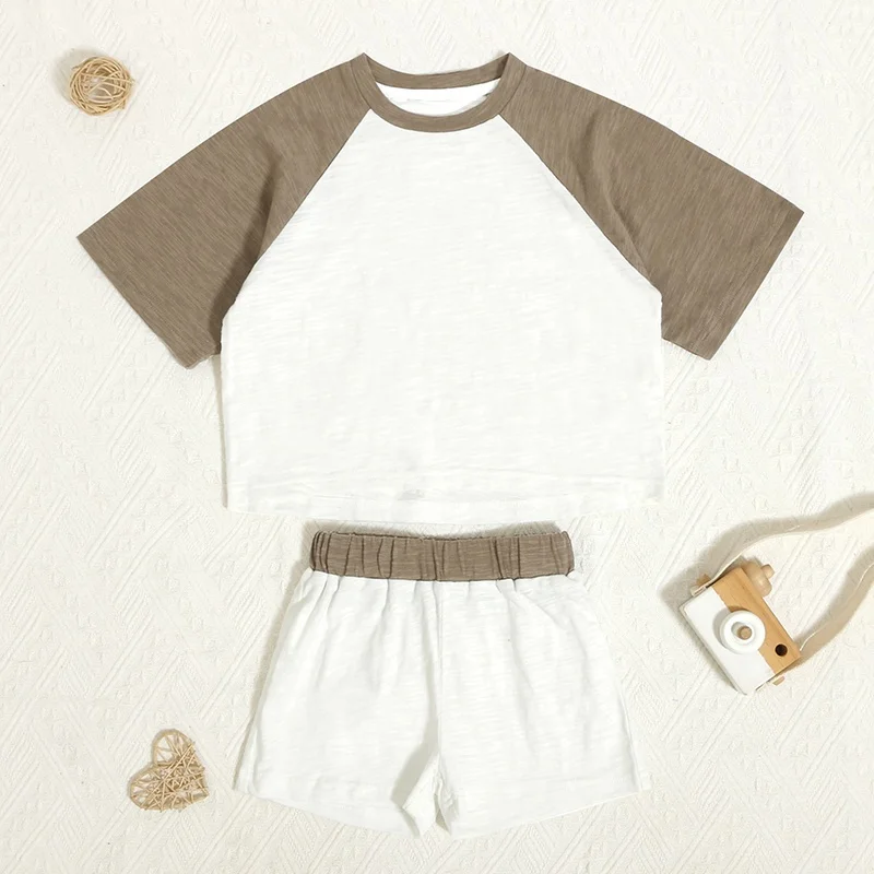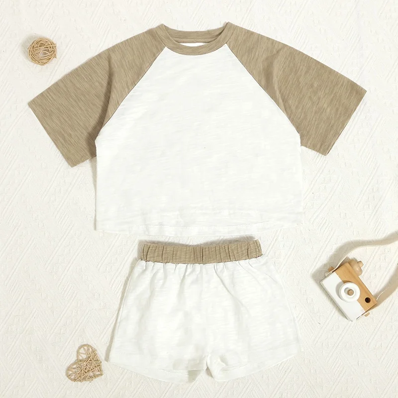 Summer Patchwork Baby Outfits Slub Cotton Short Sleeve Neutral Sets Casual Kids Sweatsuit
