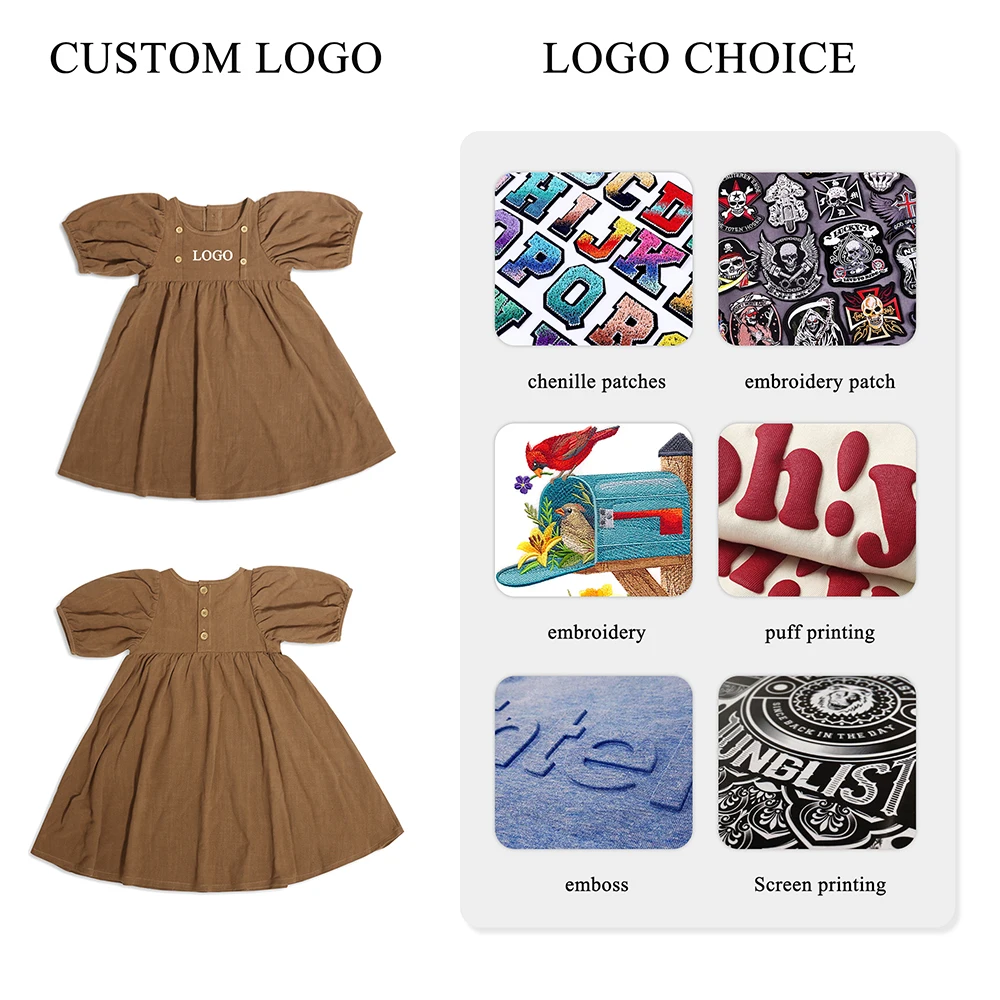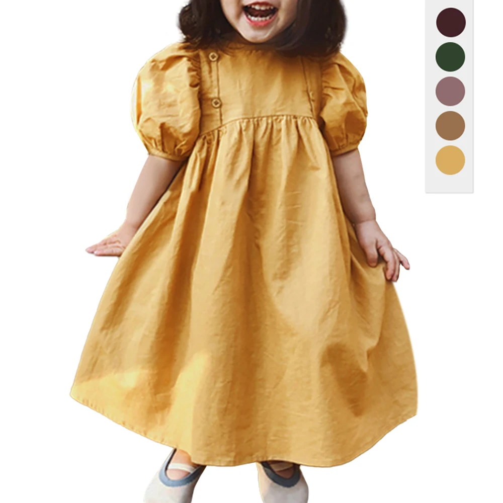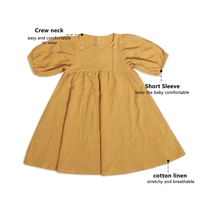 2026 New Kids Short-sleeved Dress Children's Casual Custom Embroidered Cotton Linen Solid Color Girls Dress