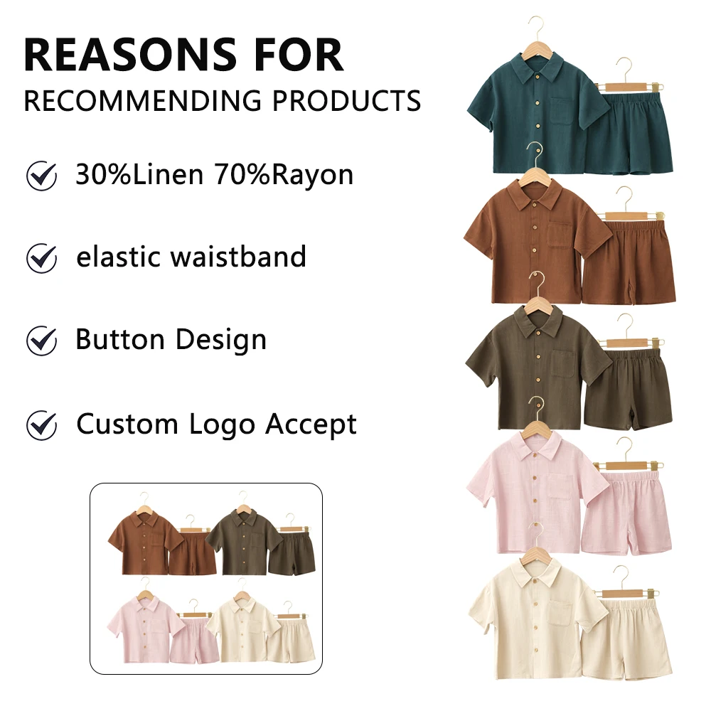 Professional Supplier Summer Infant Short Sleeves Button Design Linen and Rayon Children Two Pieces Sets