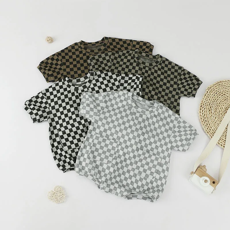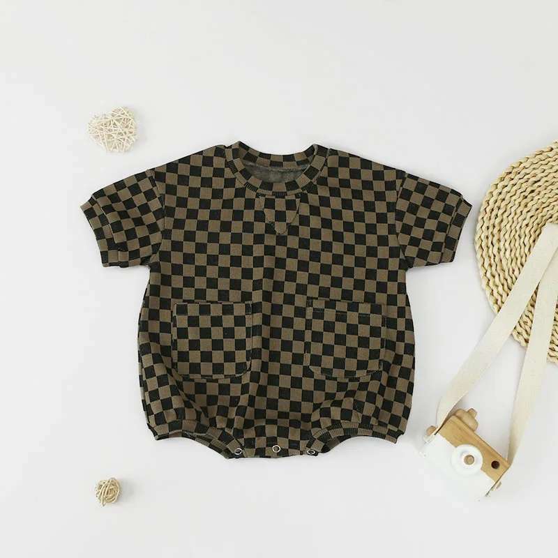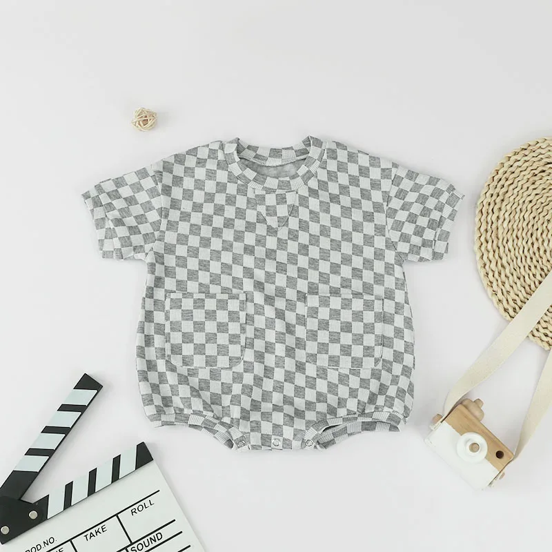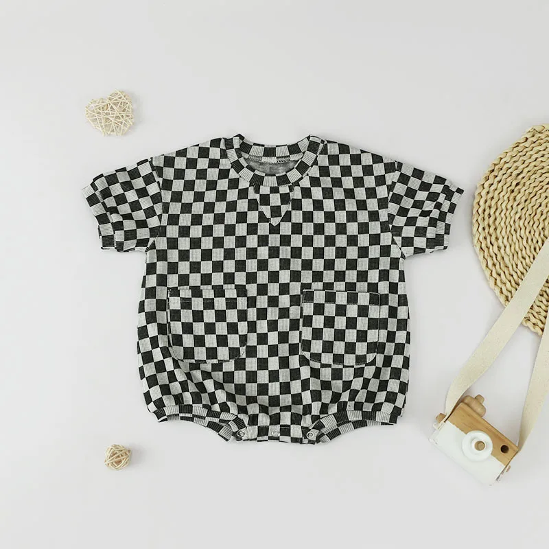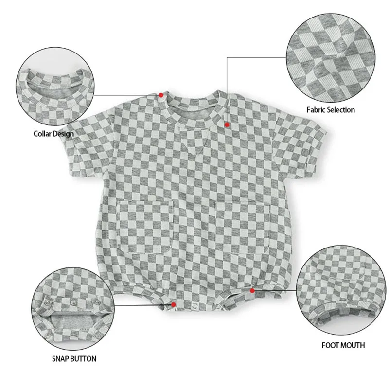 Checkered Print Baby Short Sleeve Romper Kids Clothing Jumpsuit Oversize Oneise with Front Pocket