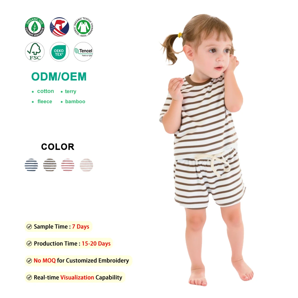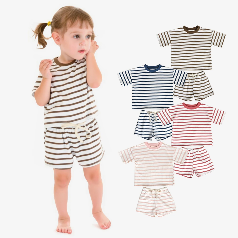Soft 100%Cotton Toddler Girls' Striped Short-Sleeve & Drawstring Kids Summer Clothe Set for Summer Daily