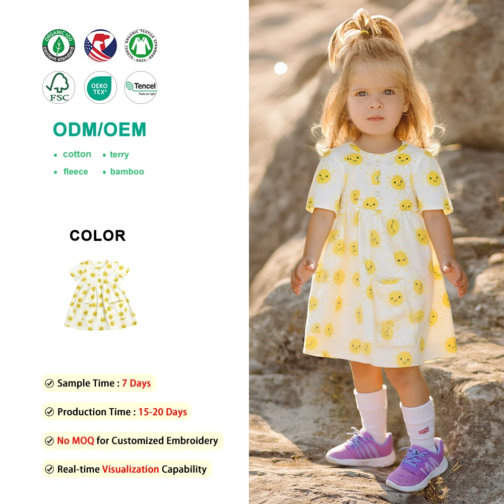 Skin-Friendly Spandex Cotton Toddler Girls Sun Print Short-Sleeve Dress for Daily & Summer Wear