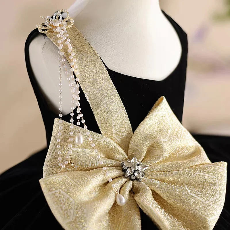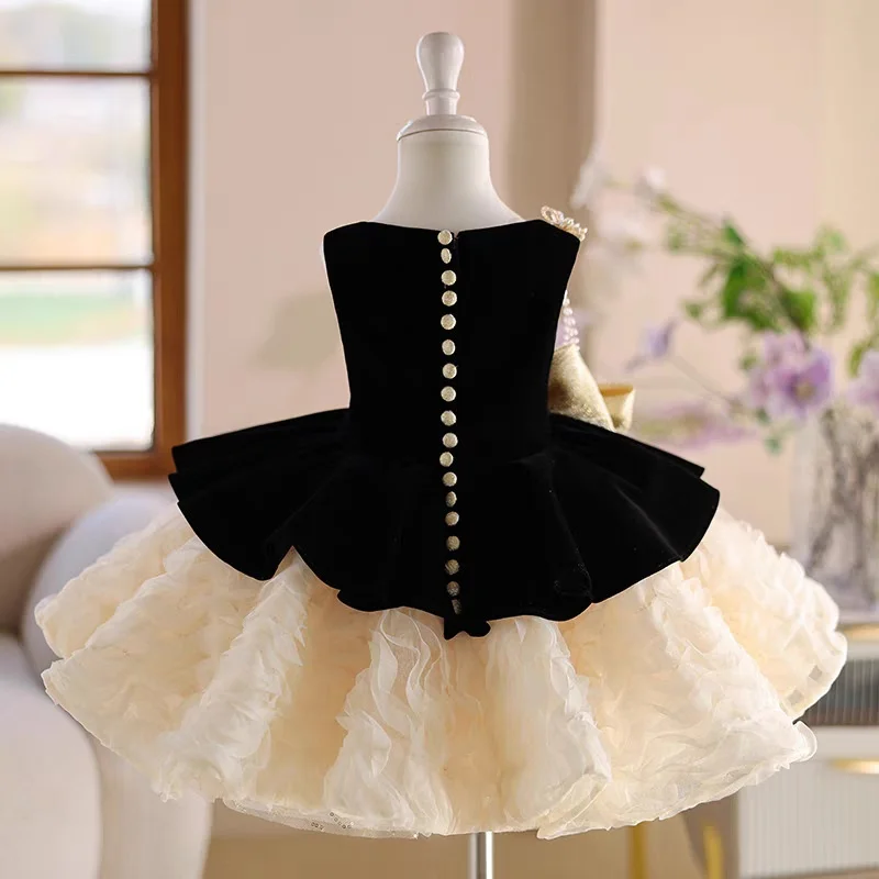 Black and Champagne-Colored Sleeveless Evening Dresses for Girls Bow Beading Pleated Layering Princess Dress for Girl