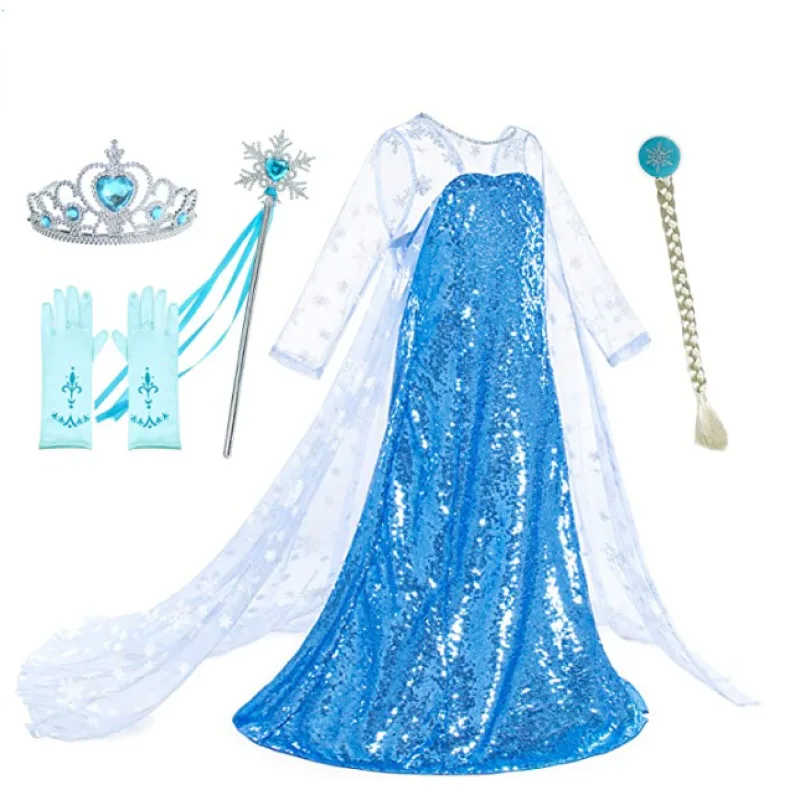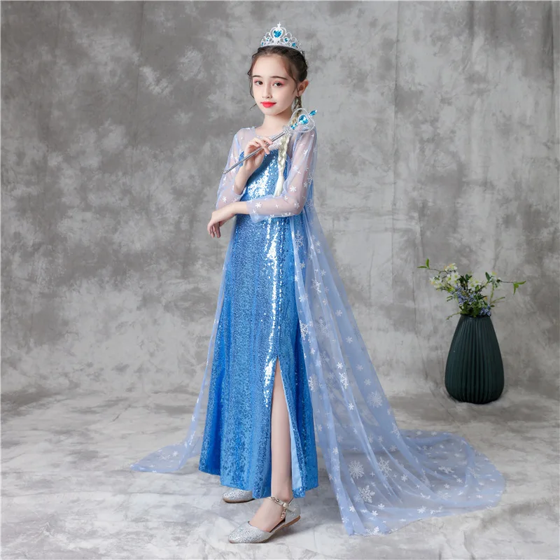Frozen Princess Girls Dress Sequined Elsa Design Long Sleeve Tail for Children's Day Performance Summer Knee-Length Dress