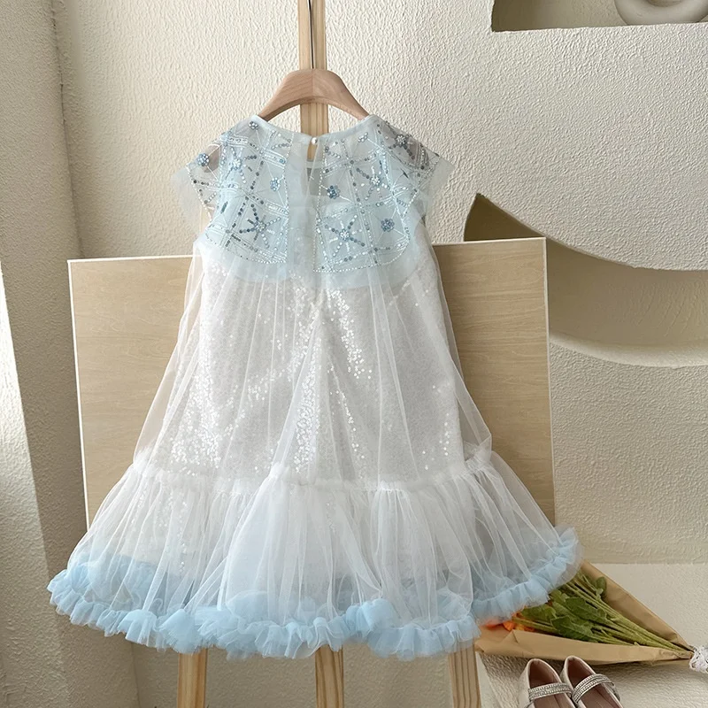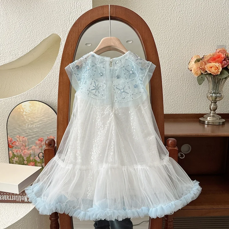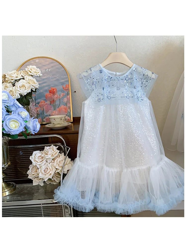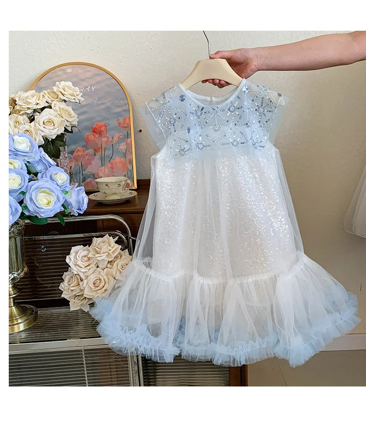 Girls Kids Elegant Sequined Mesh Sleeveless Knee - Length Evening Dress Children's Light Blue Ruffled Tulle Skirt