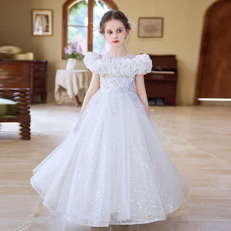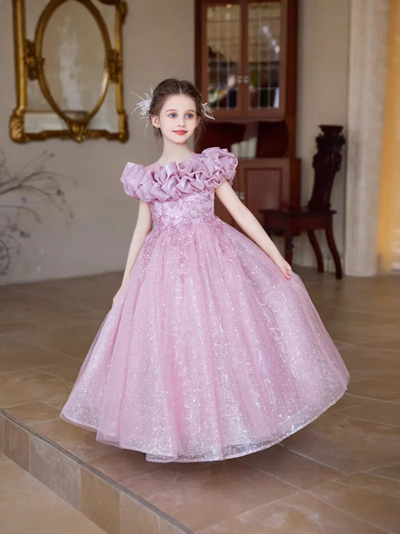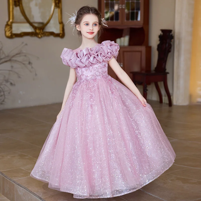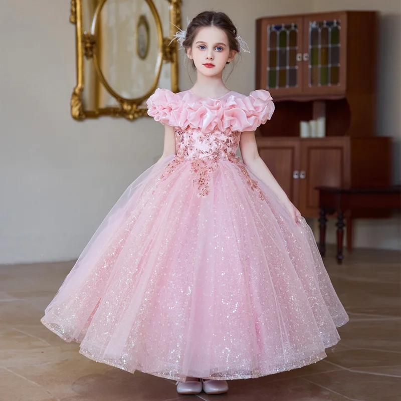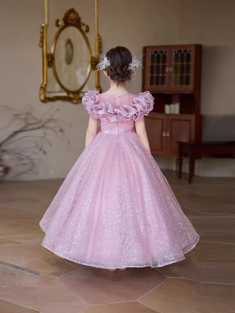 O-Neck Floral 3D Flower Mesh Lace Long Gown for Girls Children Fashion ODM Supply Summer Party Birthday Princess Dress