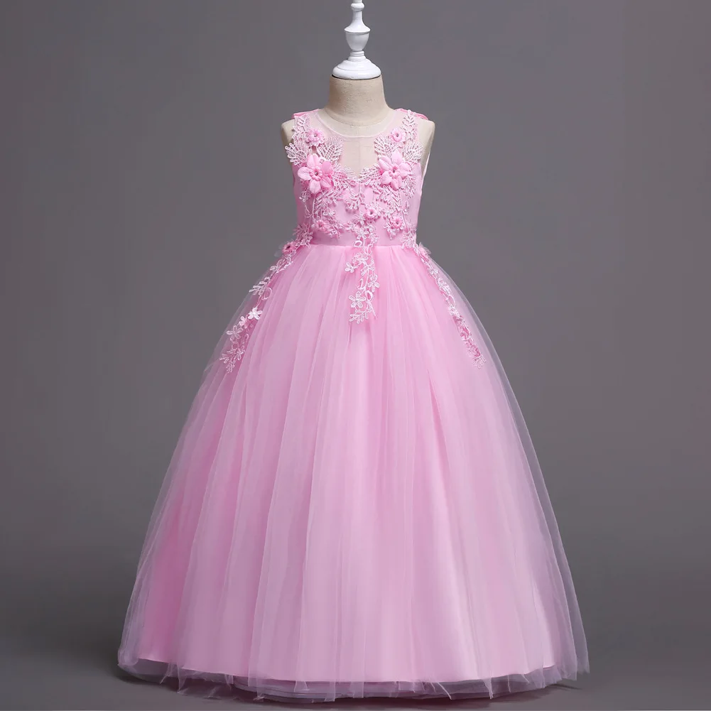 Elegant Embroidery Floral Neck Crystal in Belt Sleeveless Ball Gown Maxi 100% Polyester Party Girls Wedding Dress with Bow