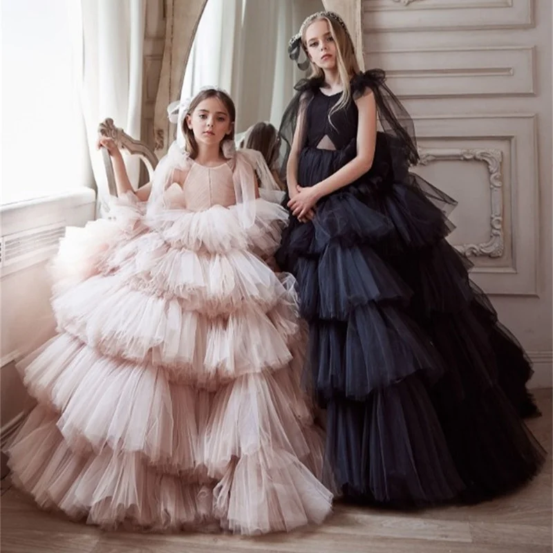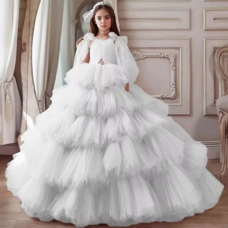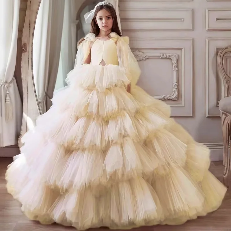 Bare Shoulders Big Skirt Hem Girls' Evening Gowns Mesh Yarn Layering Puffy Children Beauty Competition Kids Gress
