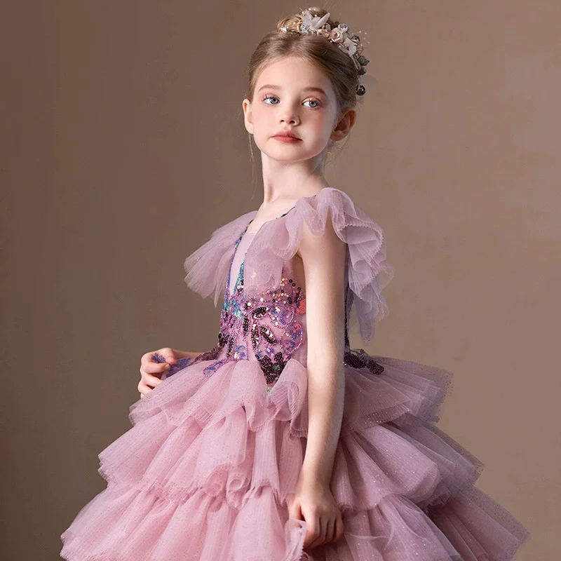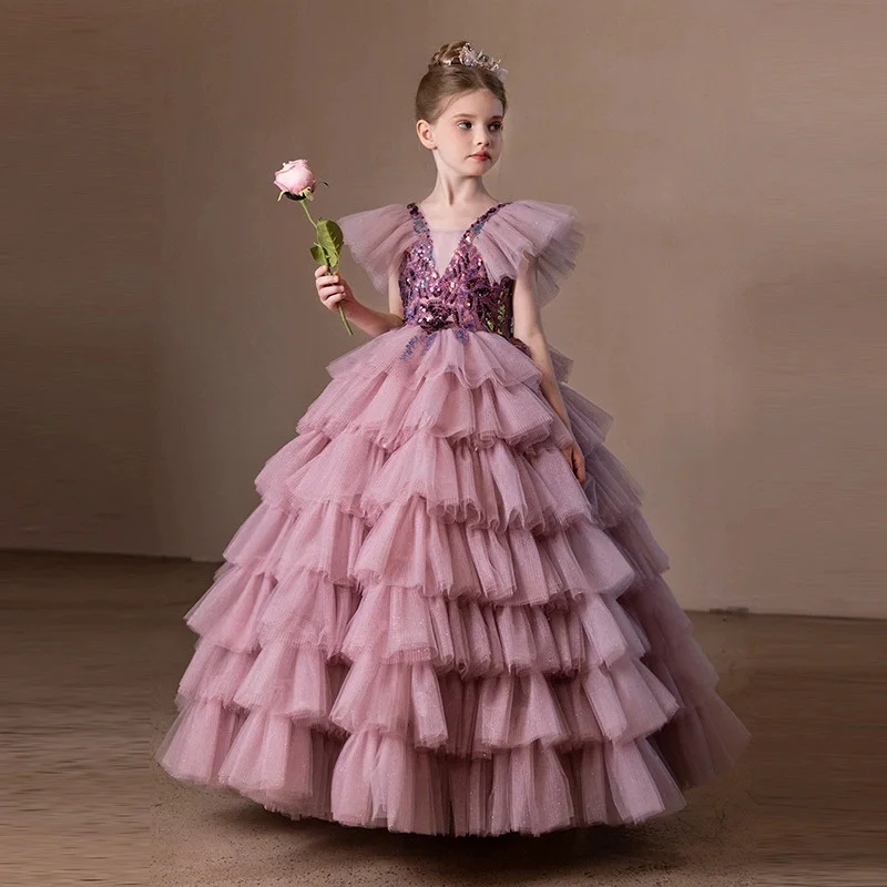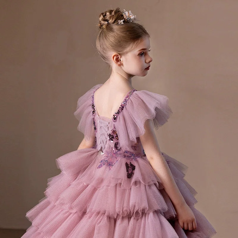 Summer Vintage Children's Dress Large Pink Sequin Flying Sleeve Formal Layered Dress for Birthday Piano Evening ODM Supply