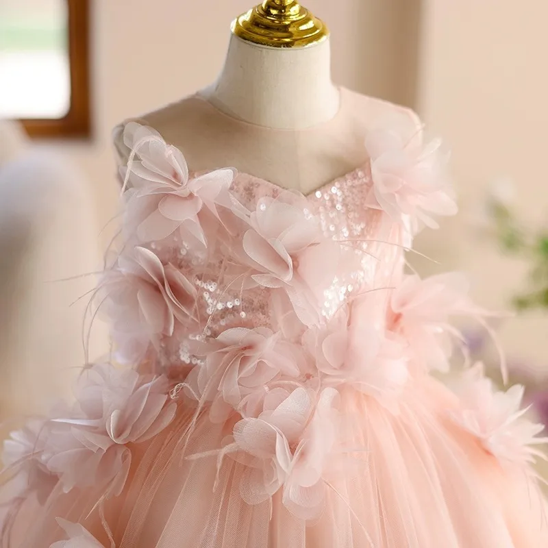 Summer 2-9 Years Girls Birthday Party Princess Dresses for Kids Polyester Sleeveless pink 3D Floral Sequins Flowers Girl Dresses