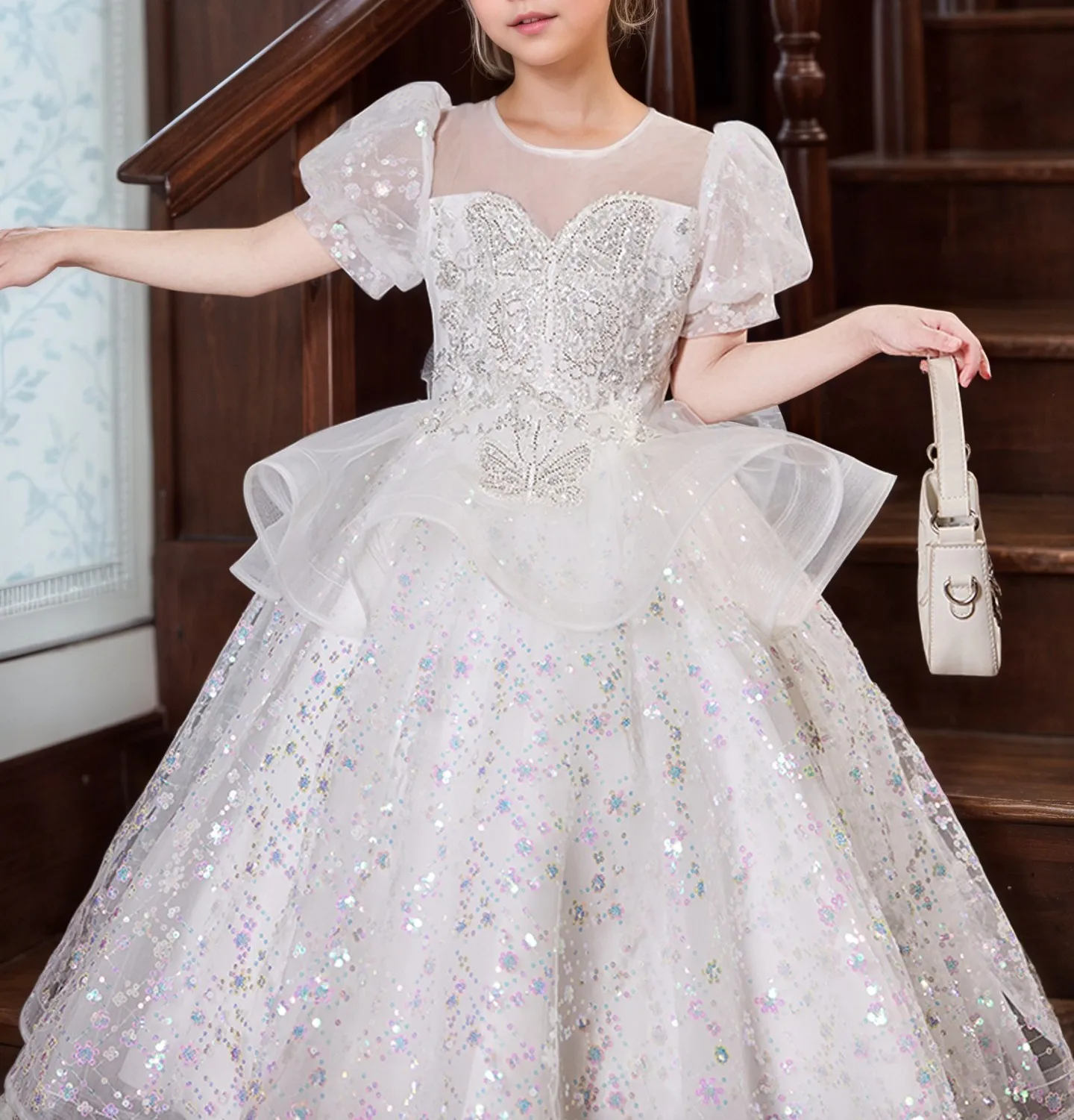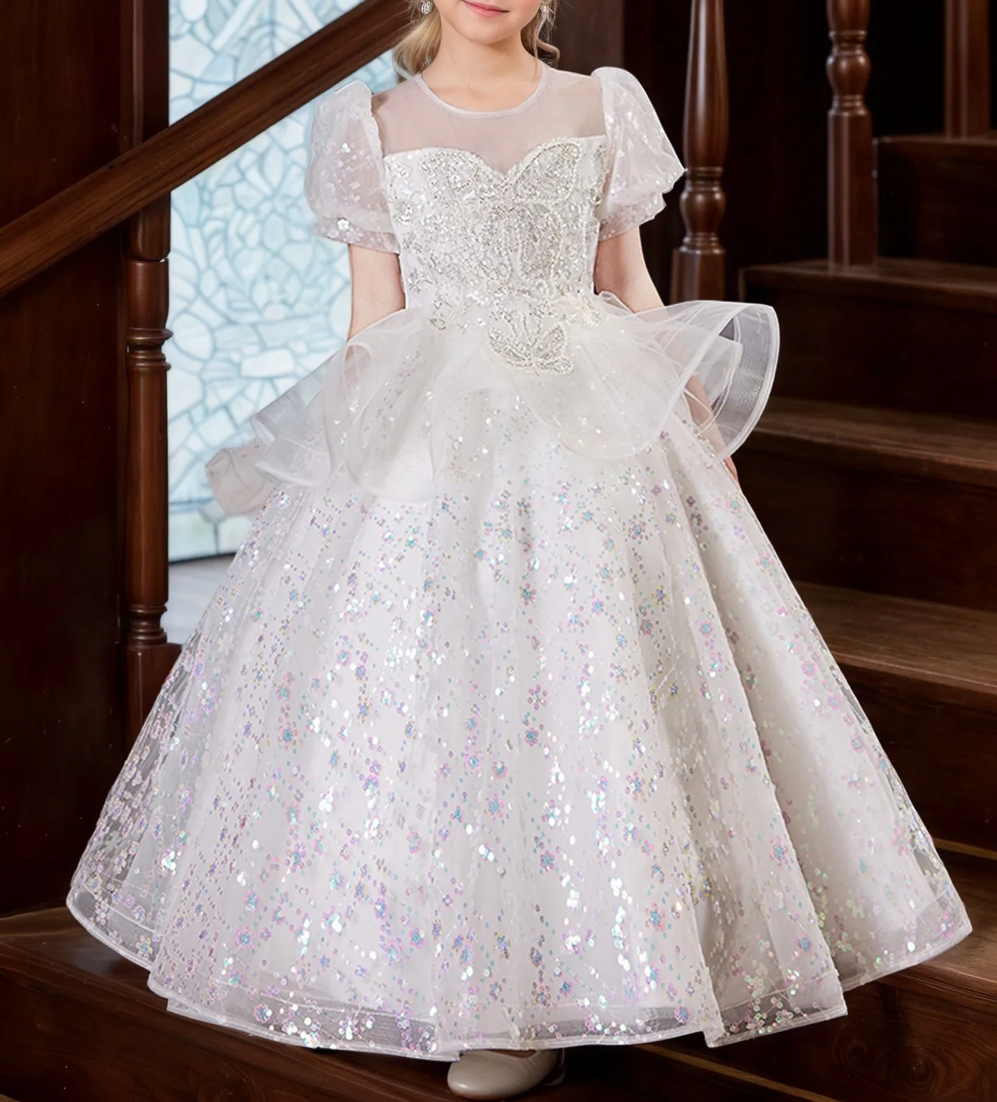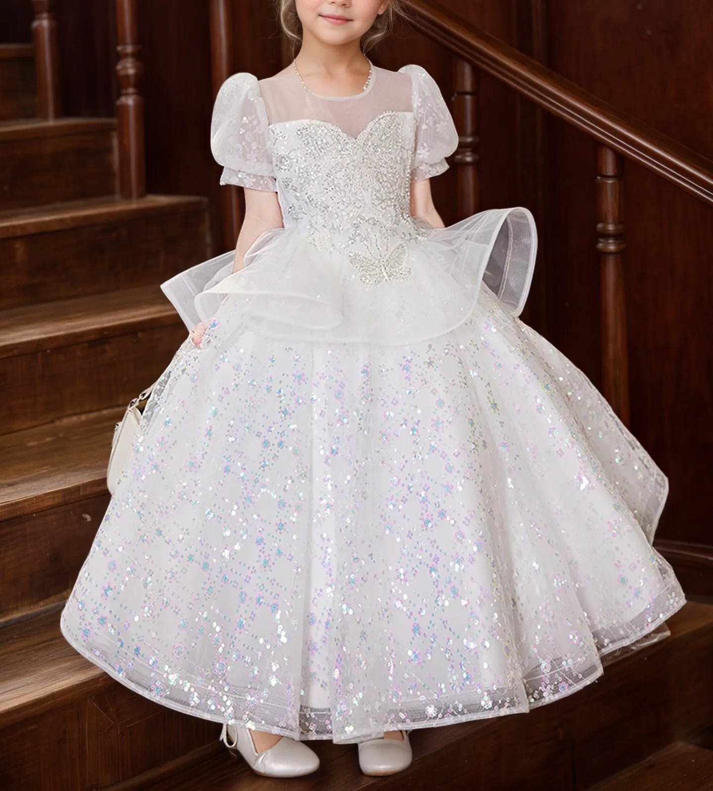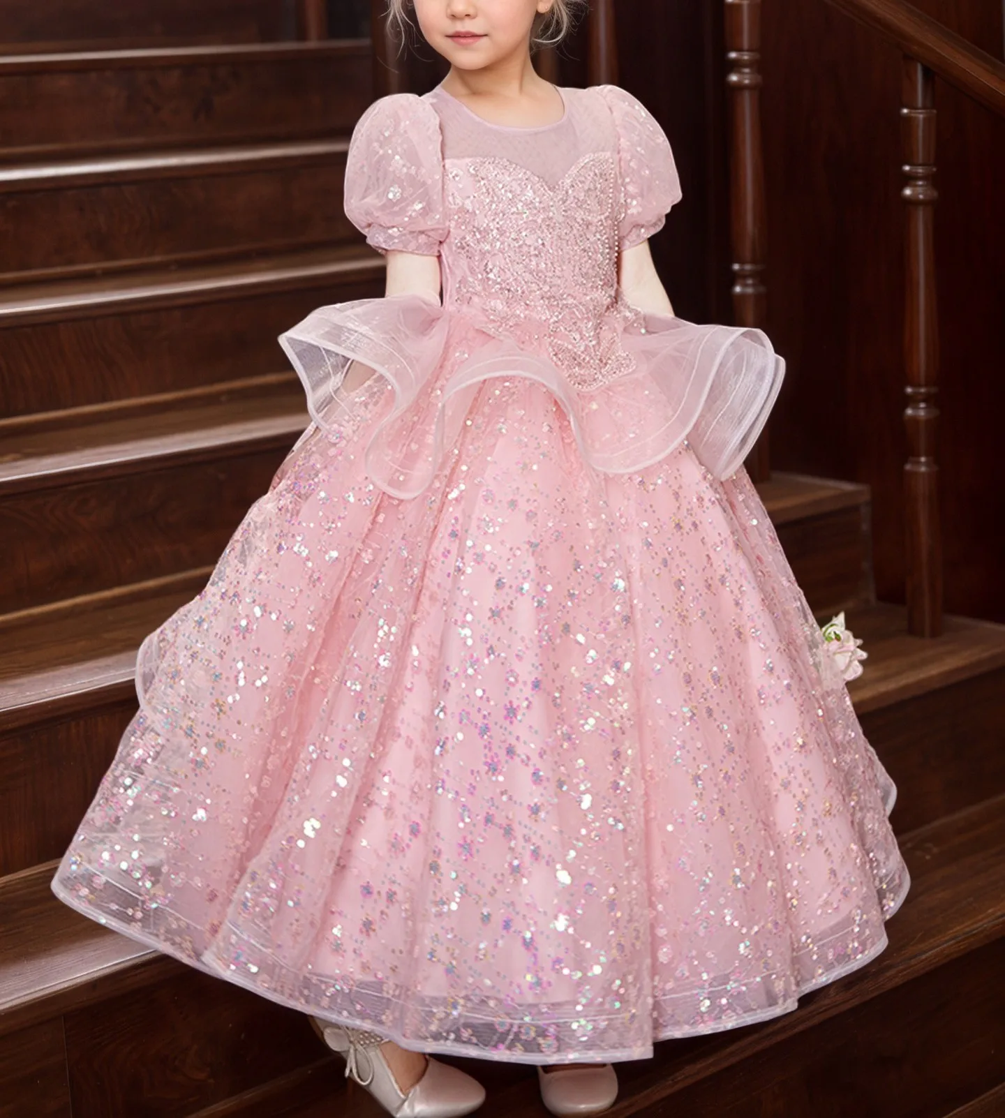 Sequins Children's Luxurious Dress Puff Sleeves Tulle Kids O-Neck Fluffy Layered Birthday Party Dresses for Girls