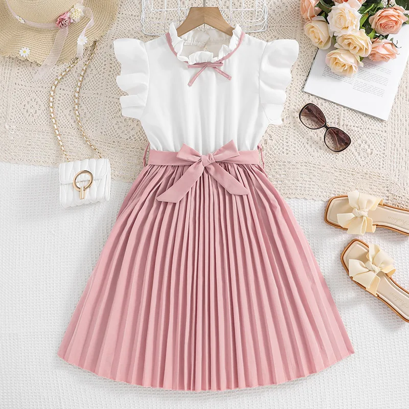 Summer 8-12Year Girls Princess Dress Elegant Party Short Sleeve Bow Tie Color-Block Solid Children's Clothes