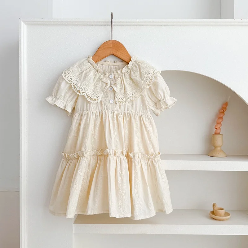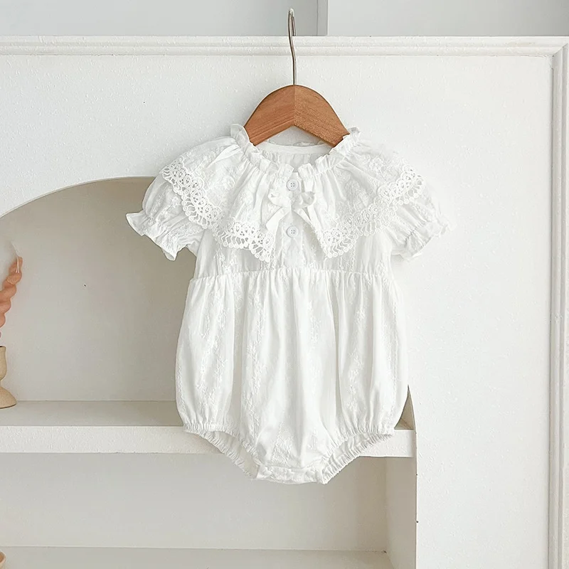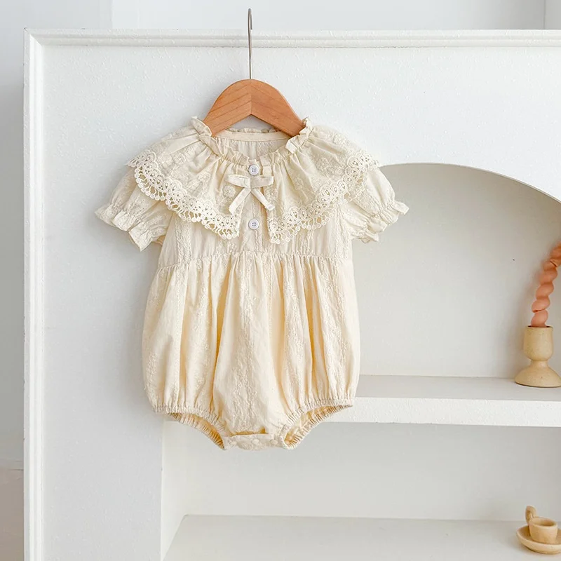 Sisters Comfort 100% Cotton Baby Girl Crawling Suit Apricot White with Puffed Sleeves and Collar Doll Clothes