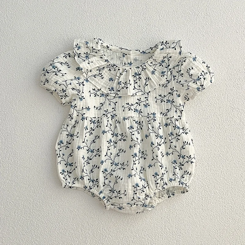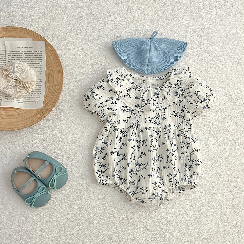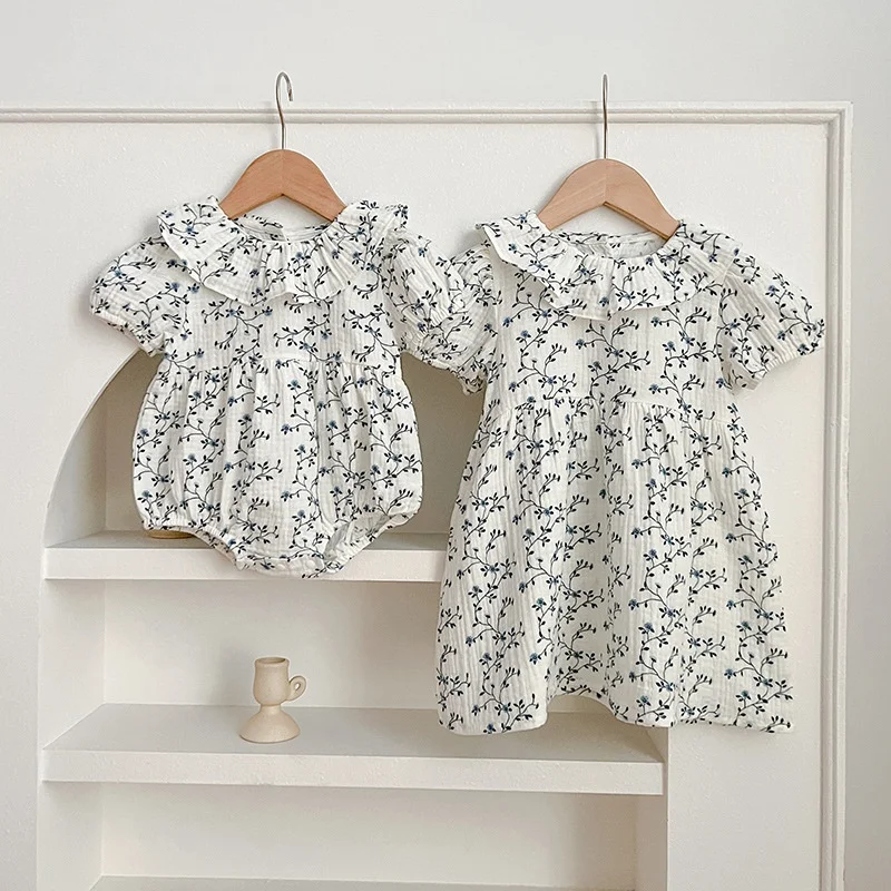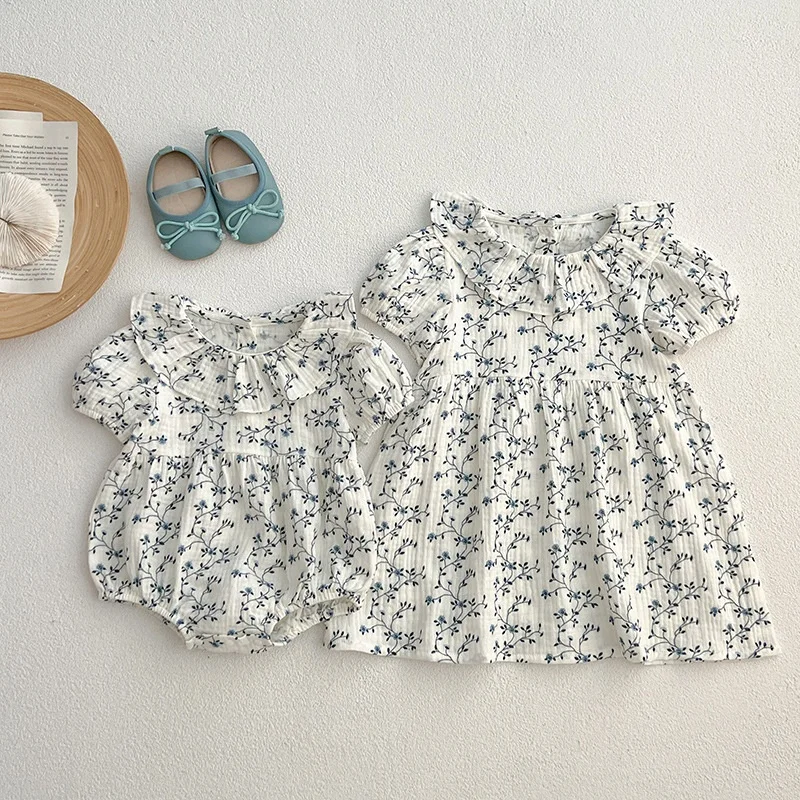 Comfortable Floral Cotton Baby Girl Dresses Casual Style Print Puffed Sleeves Birthday Suit with Collar for Crawling