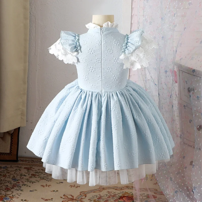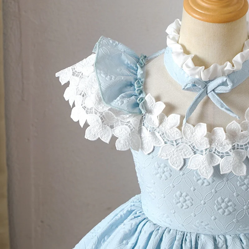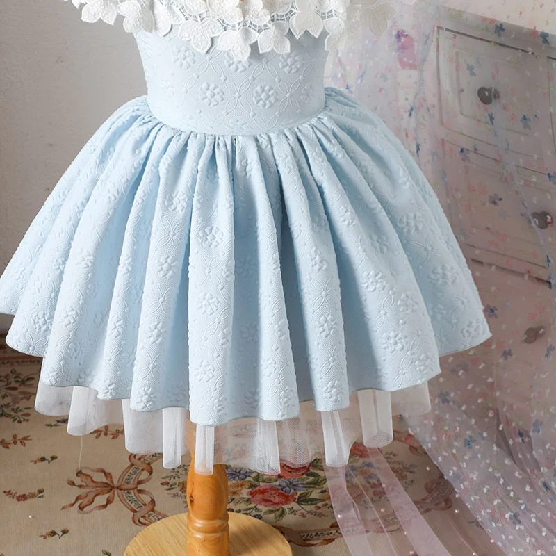 Blue White Lolita Style Princess for Girls Pleated Sleeves Multi-Layered Skirt Hem Flower Knee-Length Performance Summer