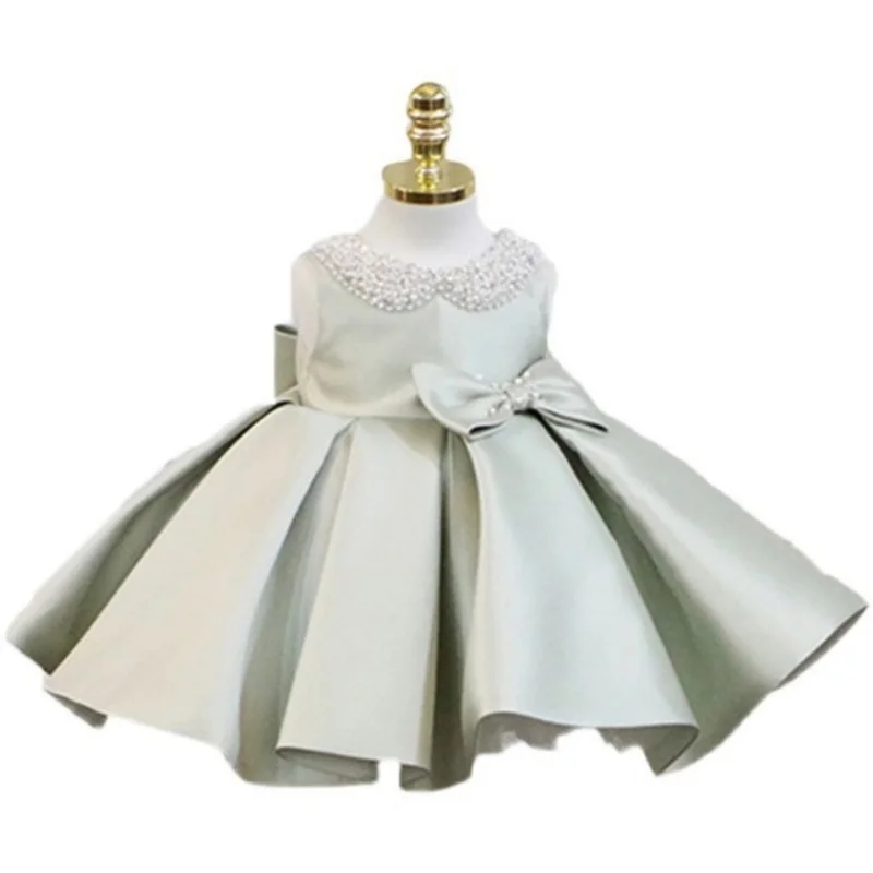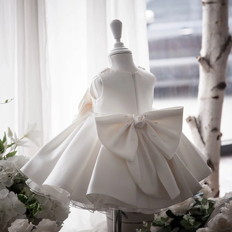 Beaded Bow Baby Collar Birthday Celebration Dresses for Girls Satin Layered Mesh Yarn Flower Girls Dresses for Wedding