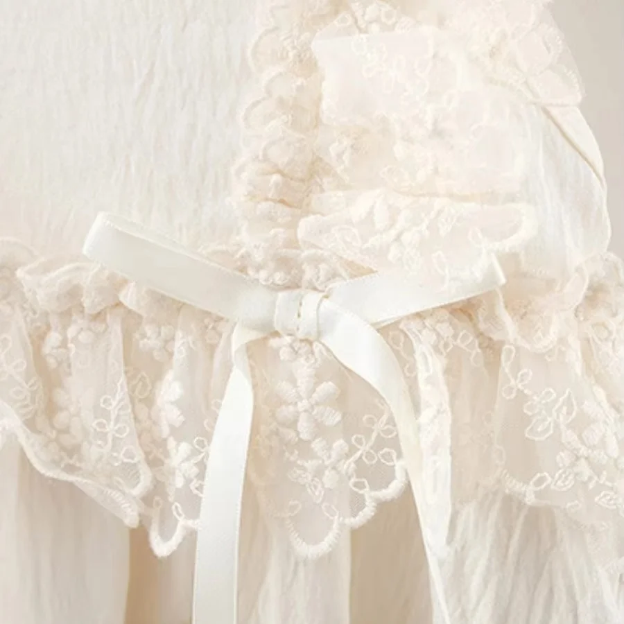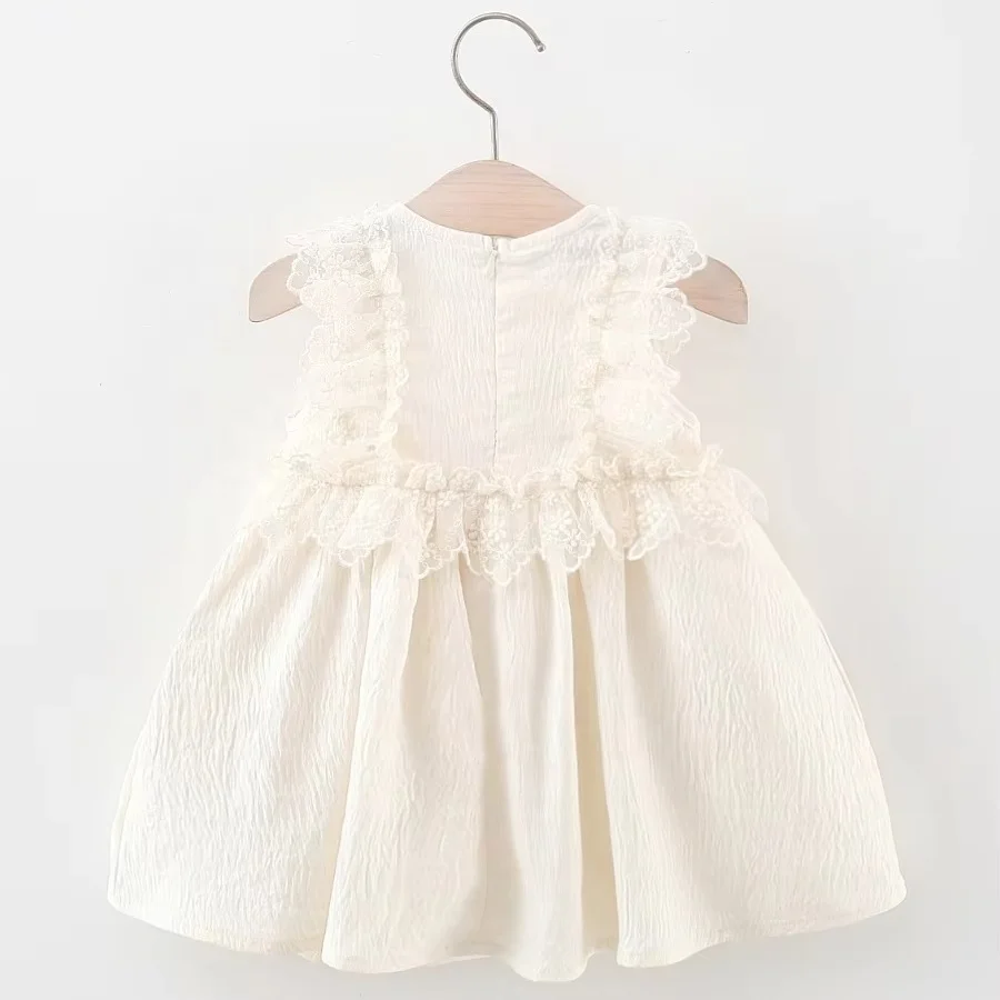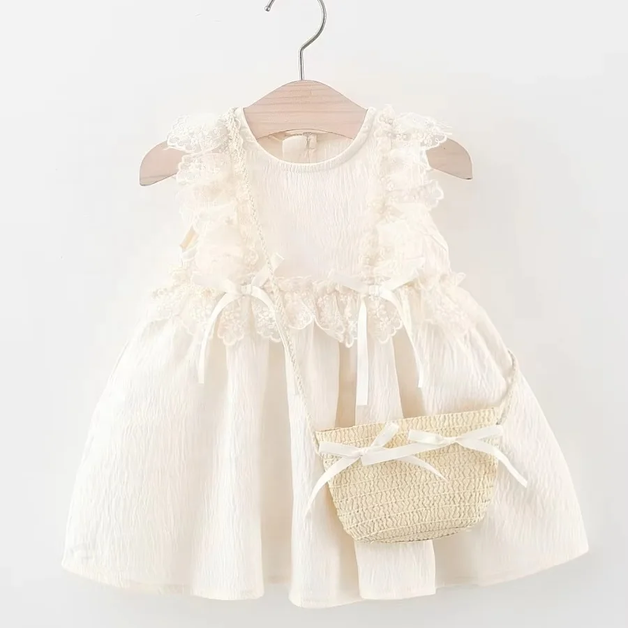 New Summer Dress for Girls with Bow Design Fly Sleeve Princess Lace O-Neck Collar Korean Style 3D Pattern Bamboo Basket Bag
