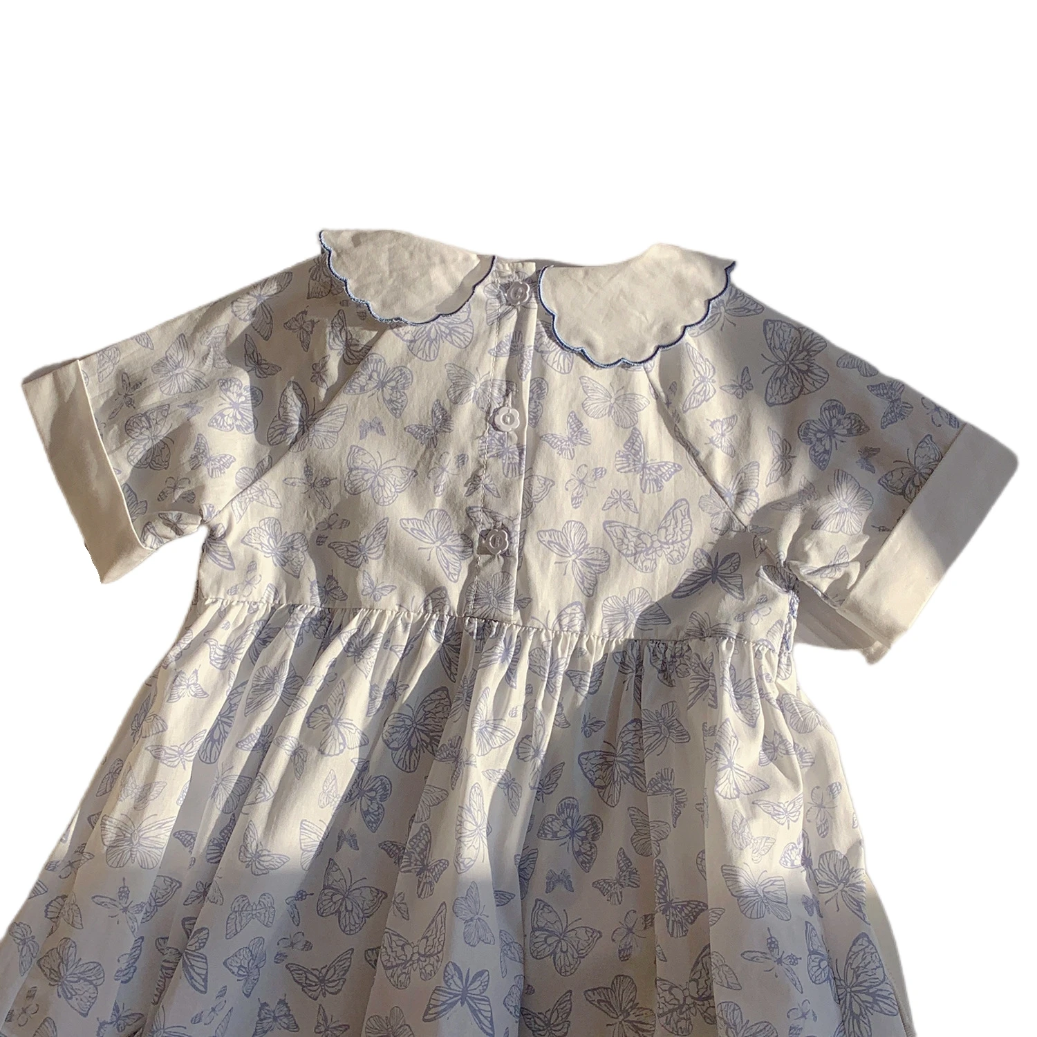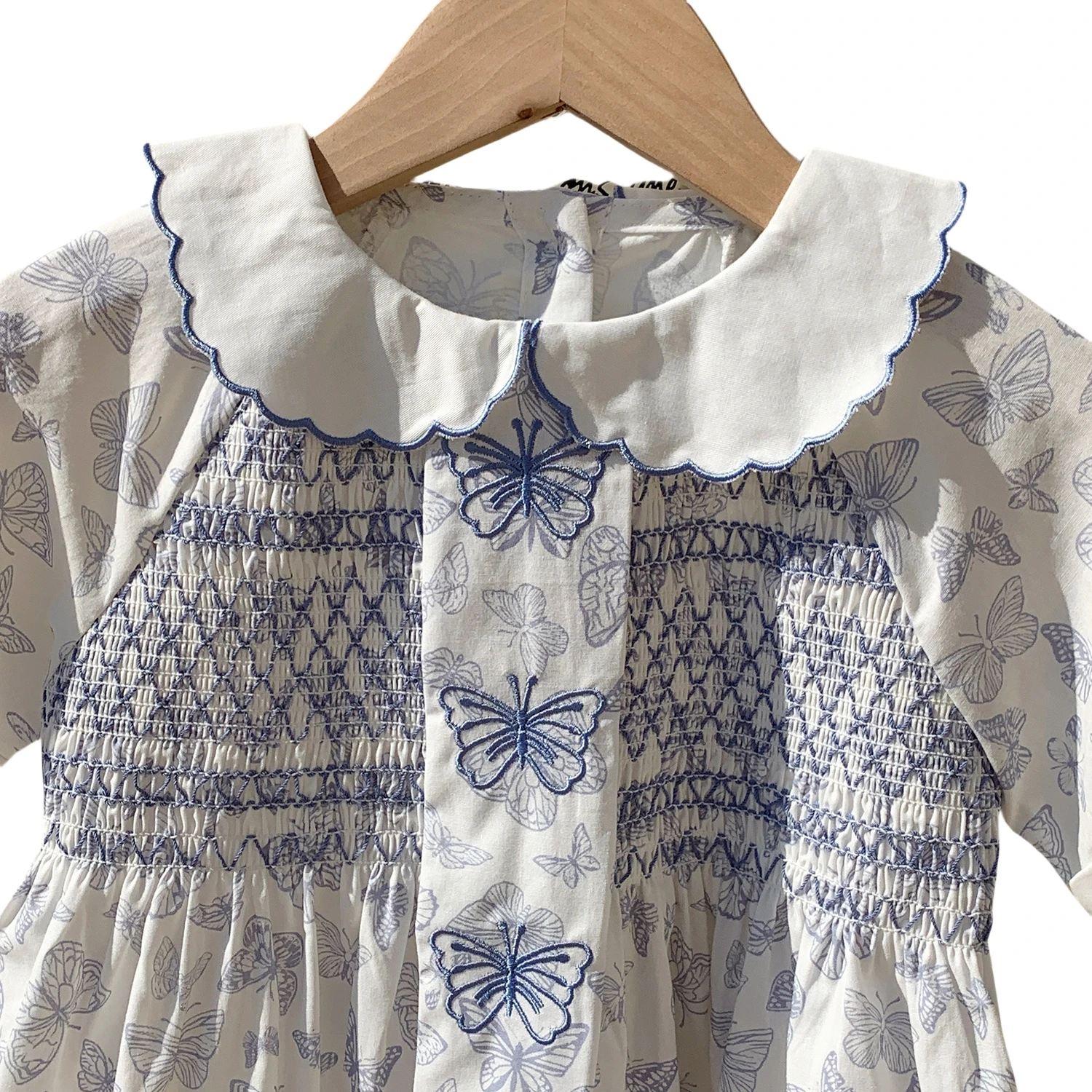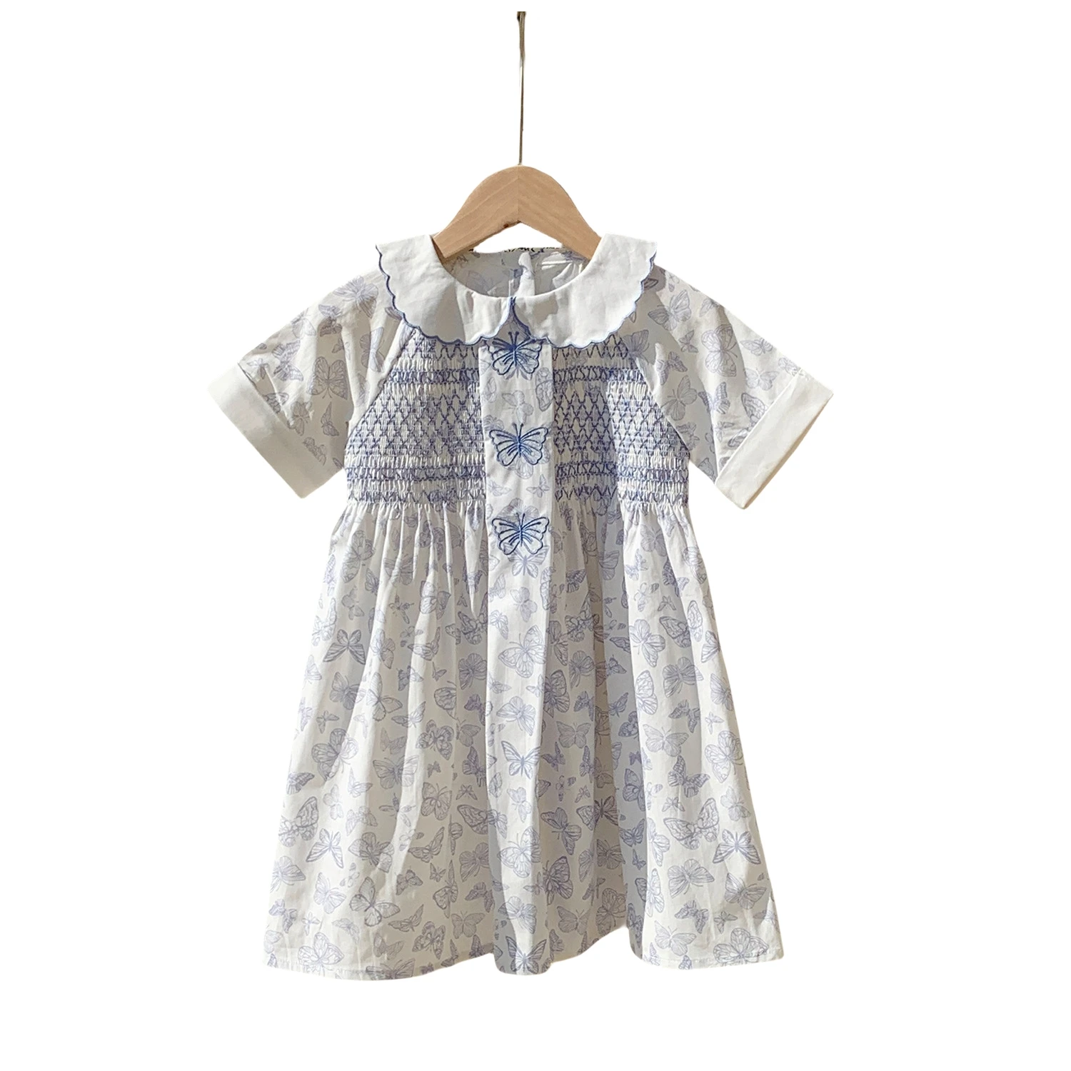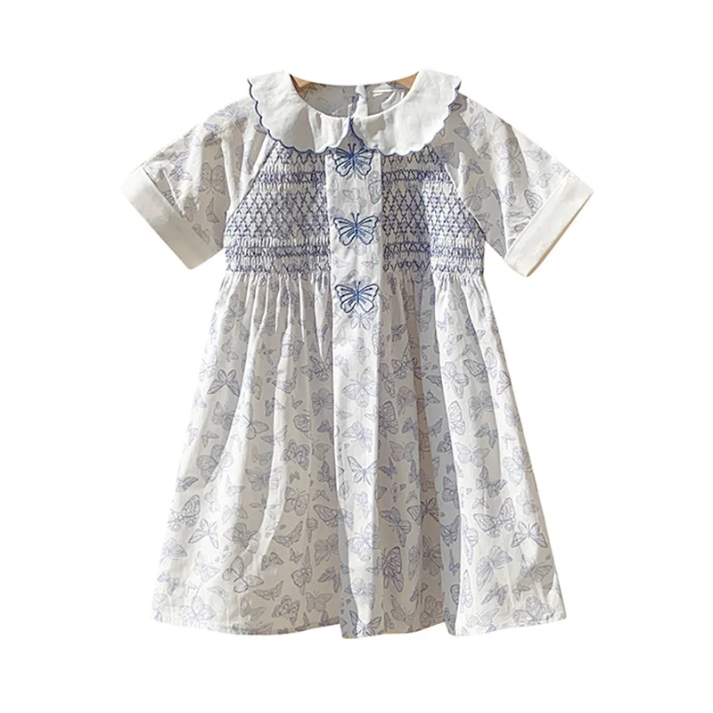 Korean Short-Sleeved Smocked Butterfly Embroidery Dress for Baby Girls Children's Clothing with Animal Pattern