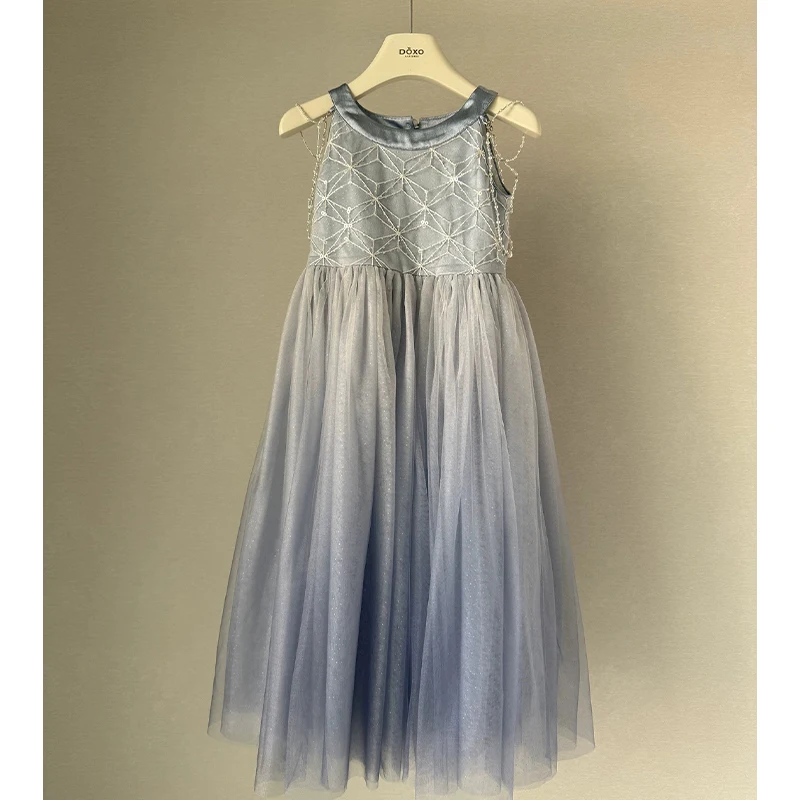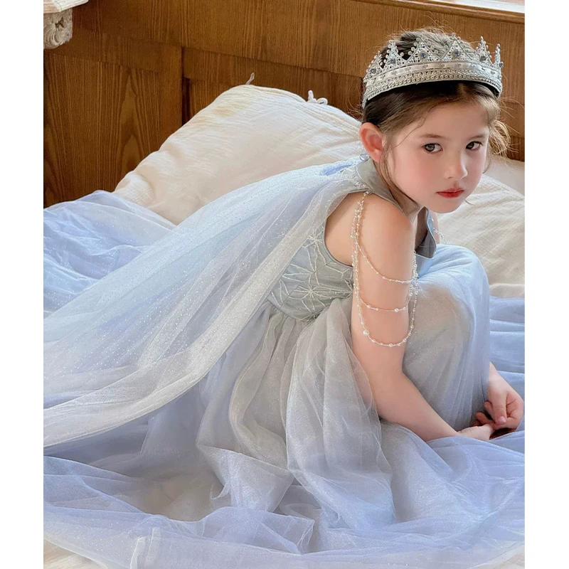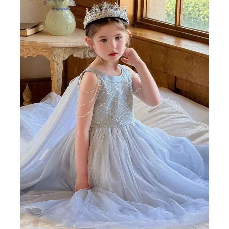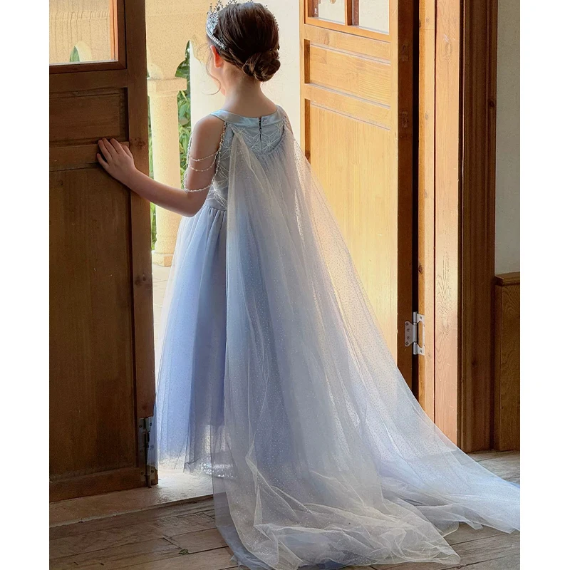 High Quality Wholesale O-Neck Dress for Girl Kids Light Blue Pearls Decorated With Cloaked Princess Party Dress