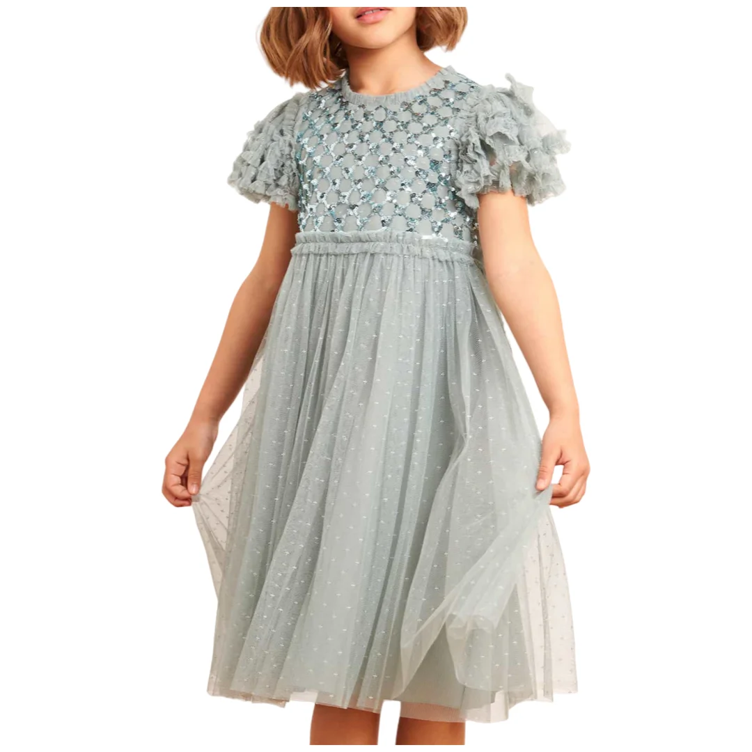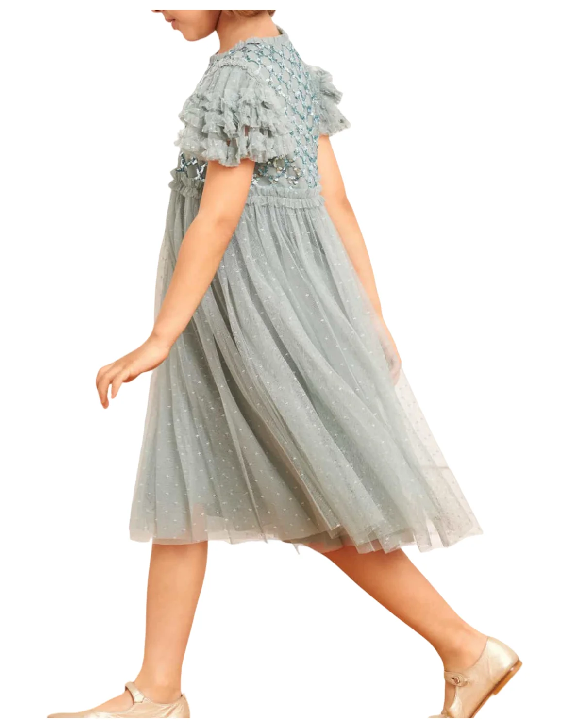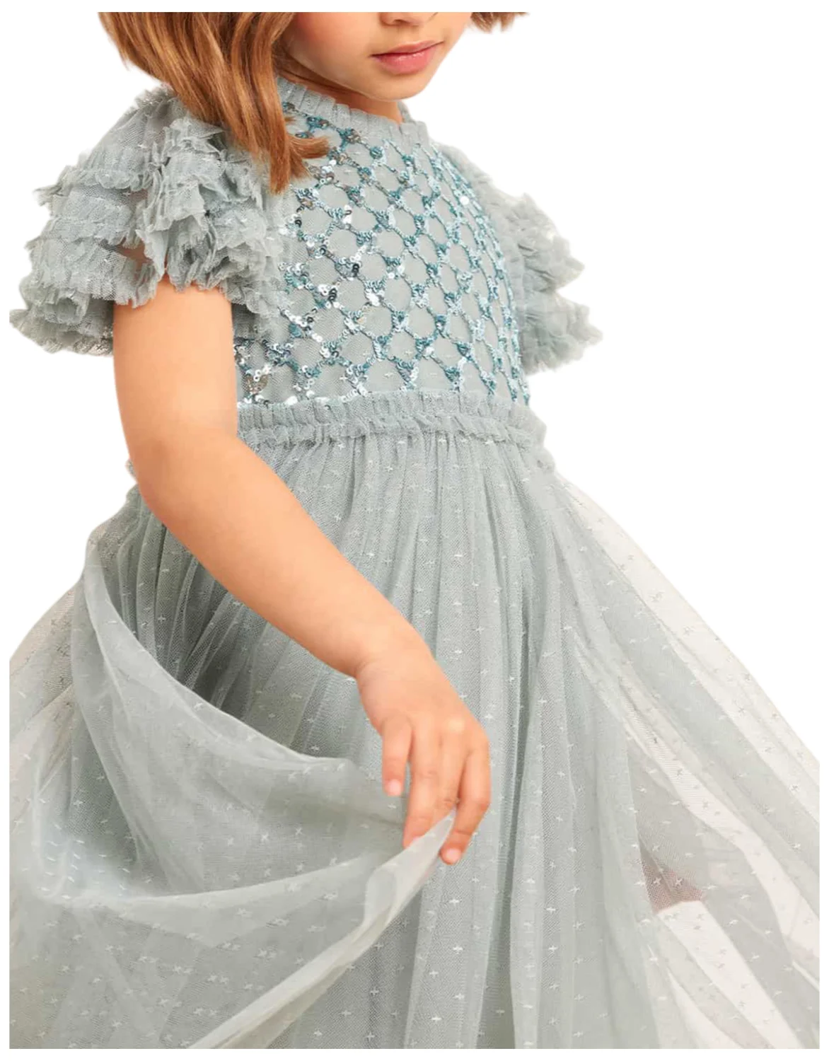 Custom ODM Children's 3D Sparkling Princess Skirt Light Blue Sequined Tulle Summer Knee-Length A-Line Ruffled Sleeves Girls