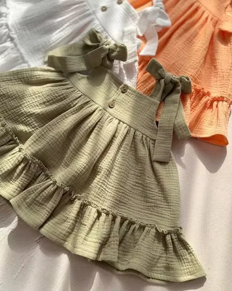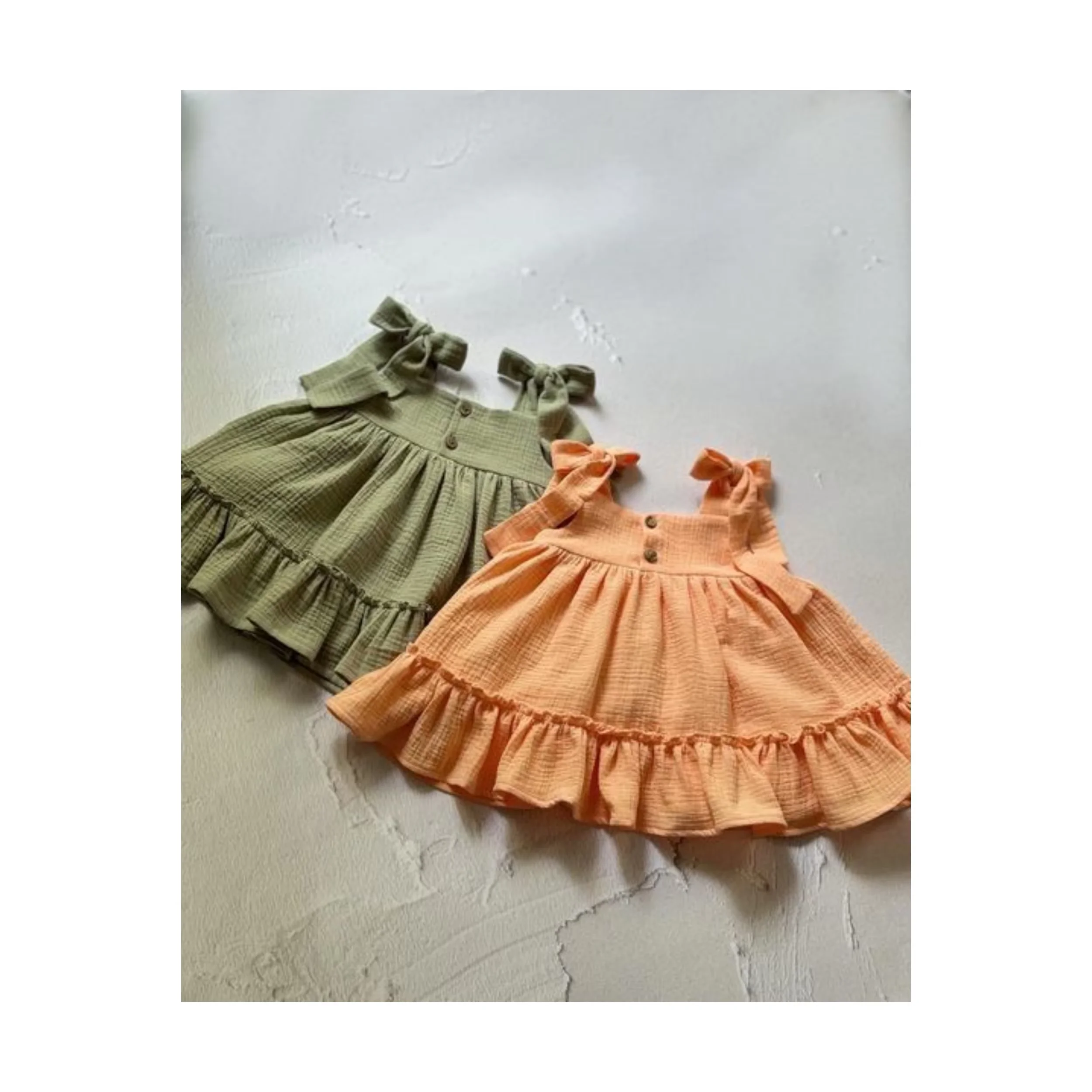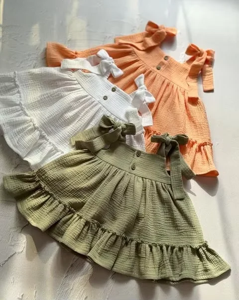 Customized Summer Soft Chiffon Pleated Dress Solid Color with Cute Print Decoration for Small Size Baby Girls for Children