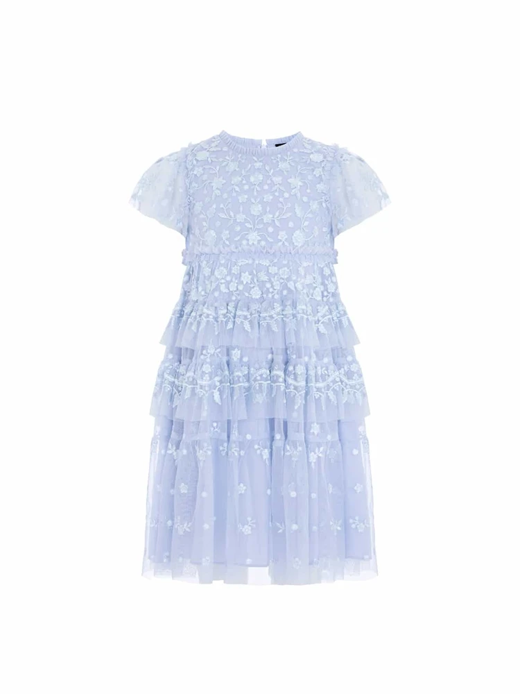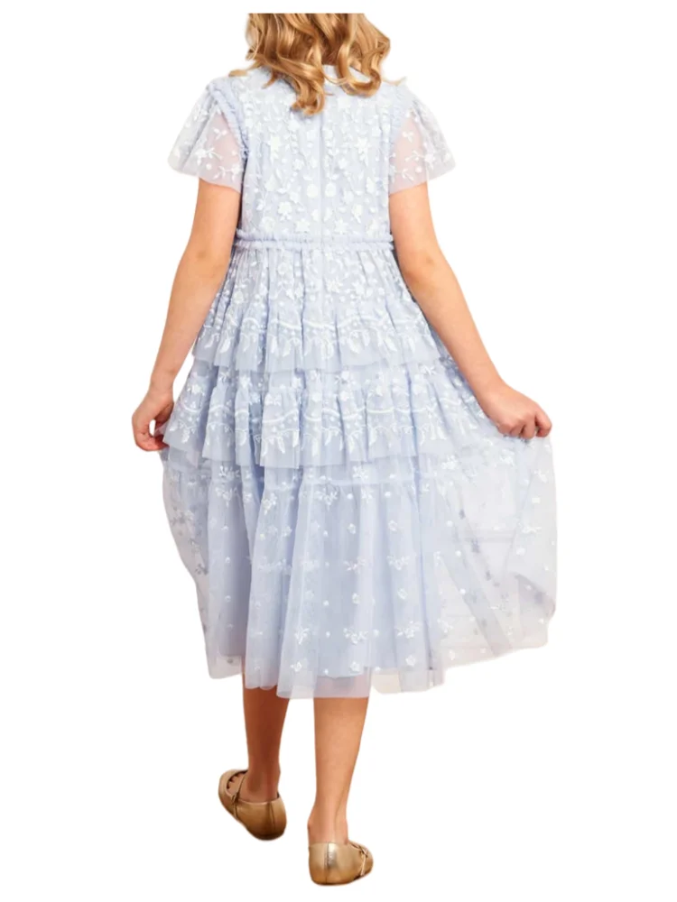 Elegant Children's Pale Blue Lace Evening Dress Girls Short Sleeves Knee Length Tulle Fluffy Gown