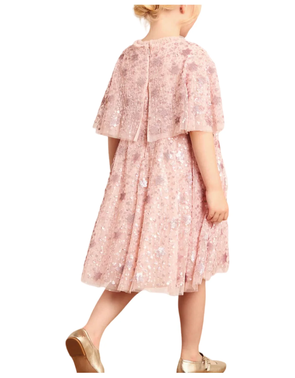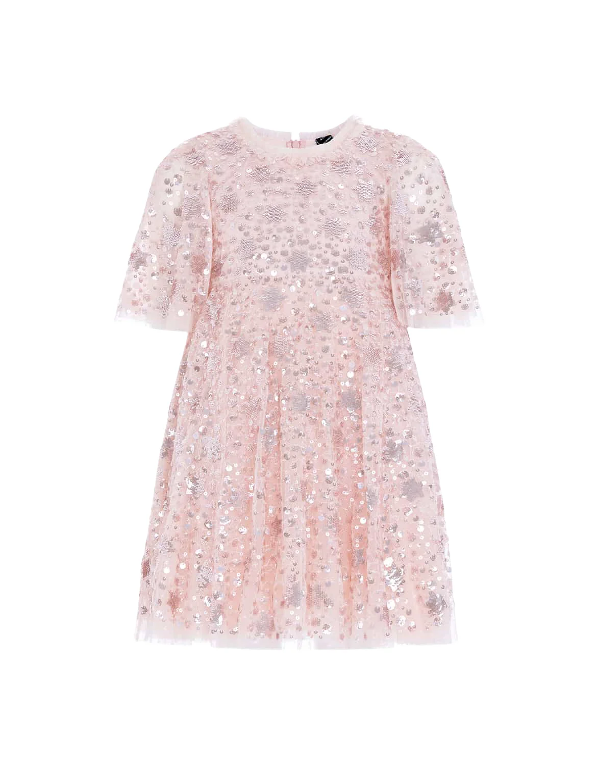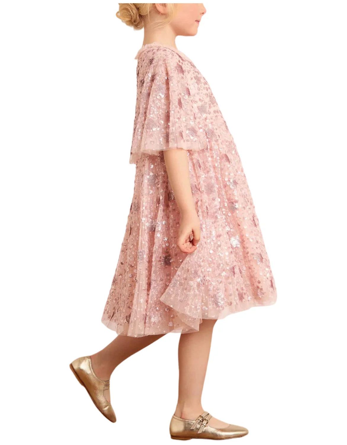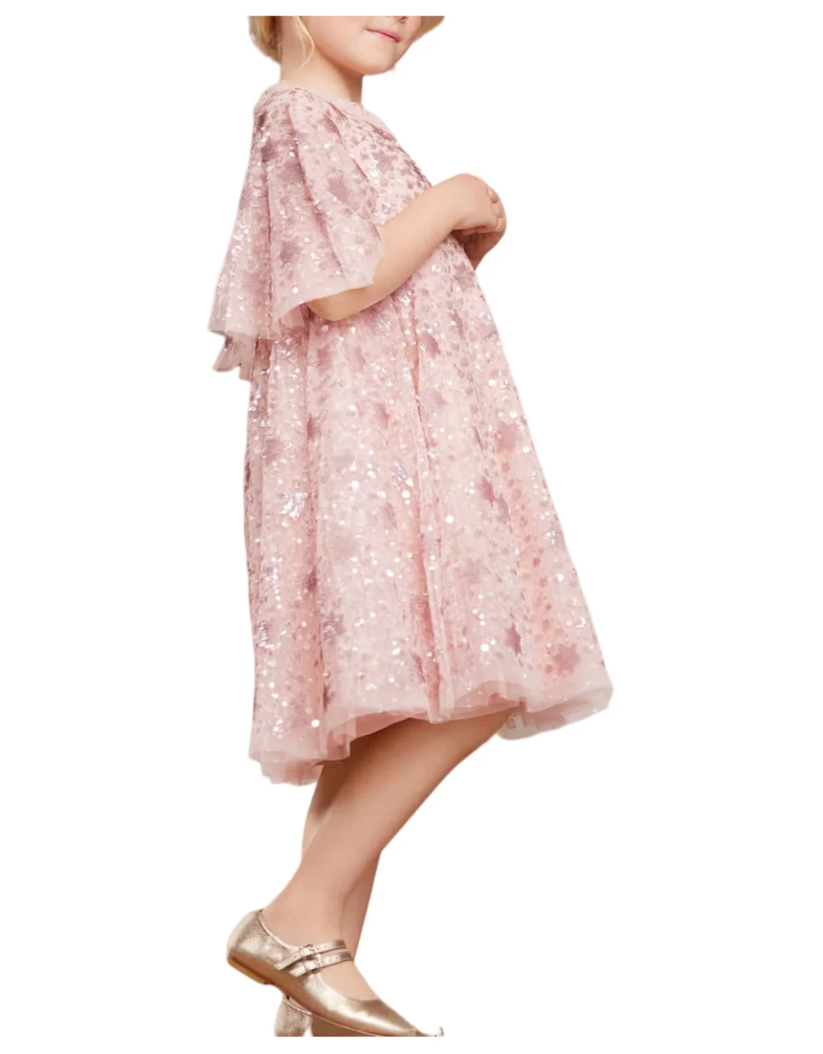 Children's Fluffy Knee Length Evening Dress Girls Kids Short Sleeve Star Sequined Formal Gown