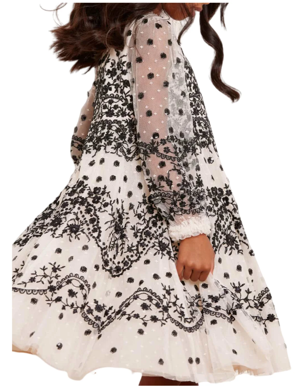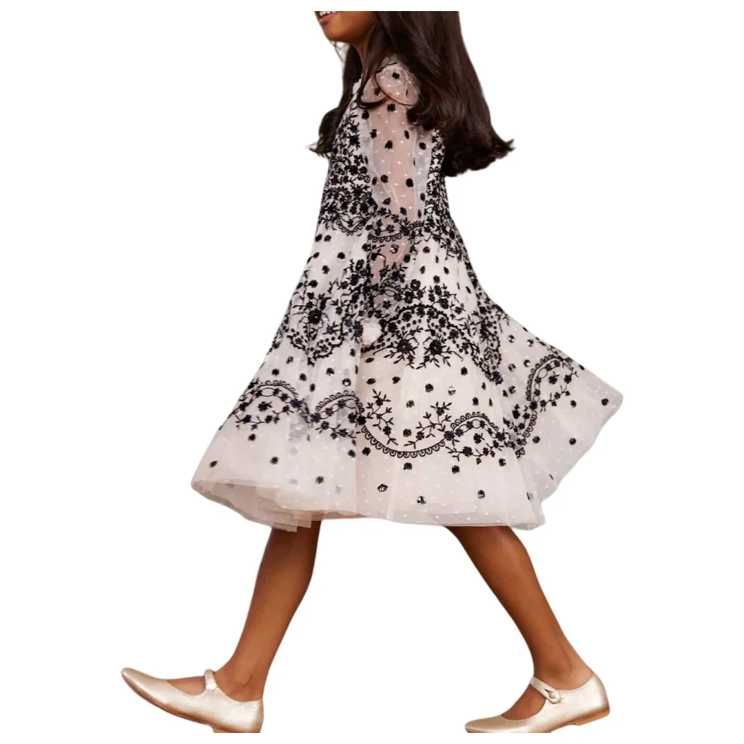 Elegant Children's Long Sleeve White Evening Dress Girls Kids Black Embroidered Lace Formal Gown