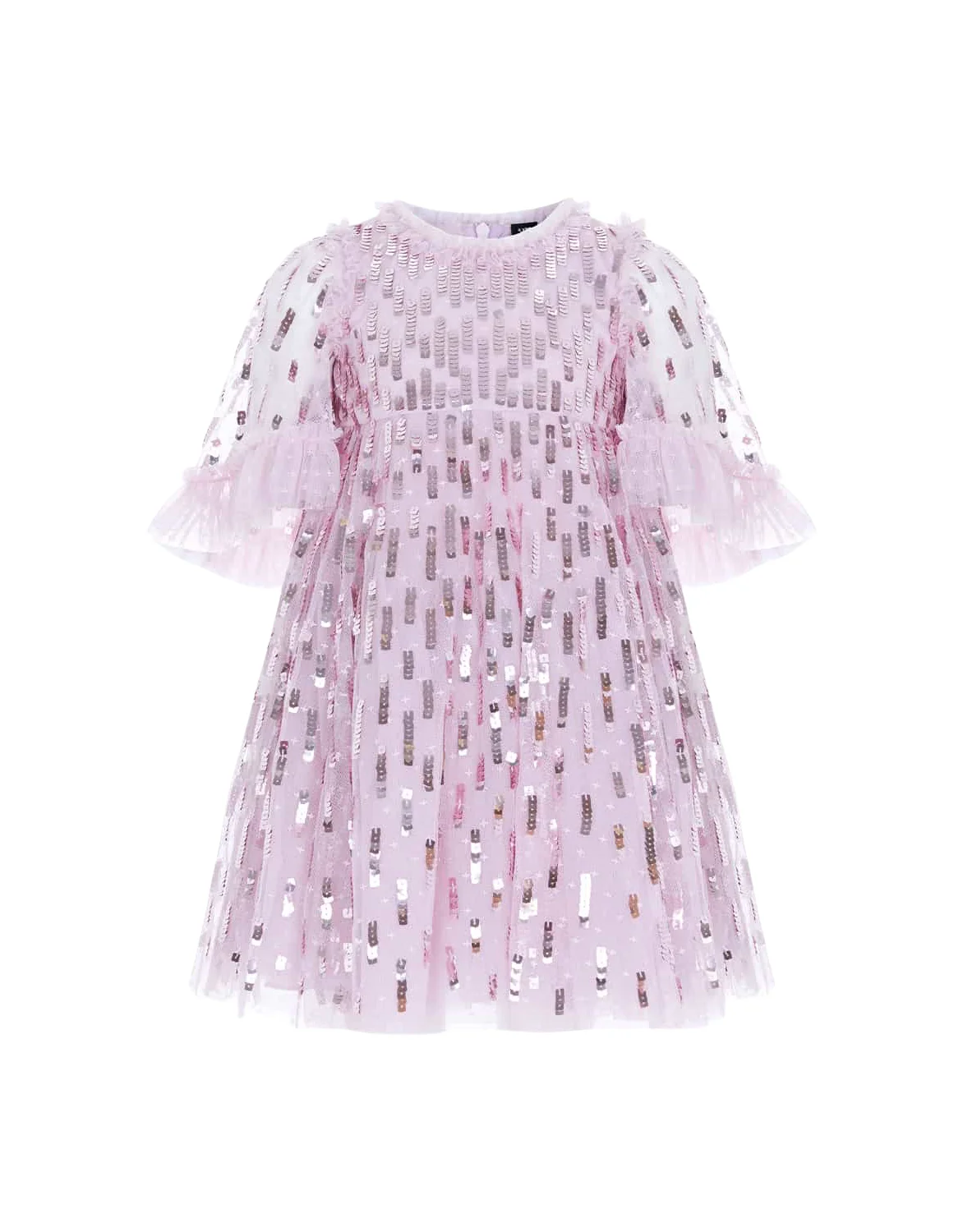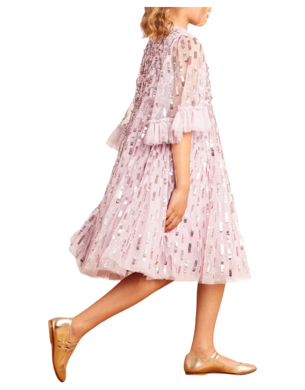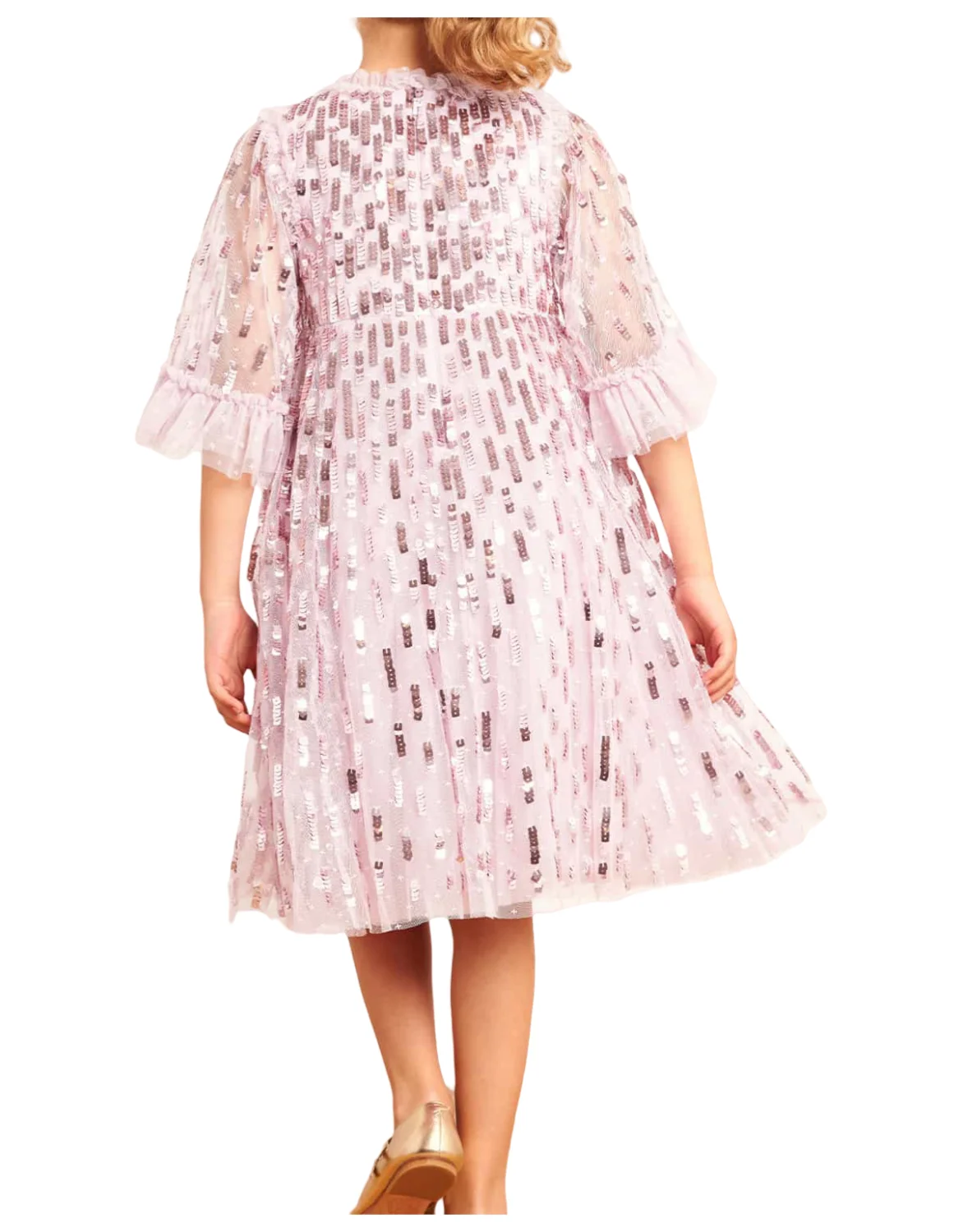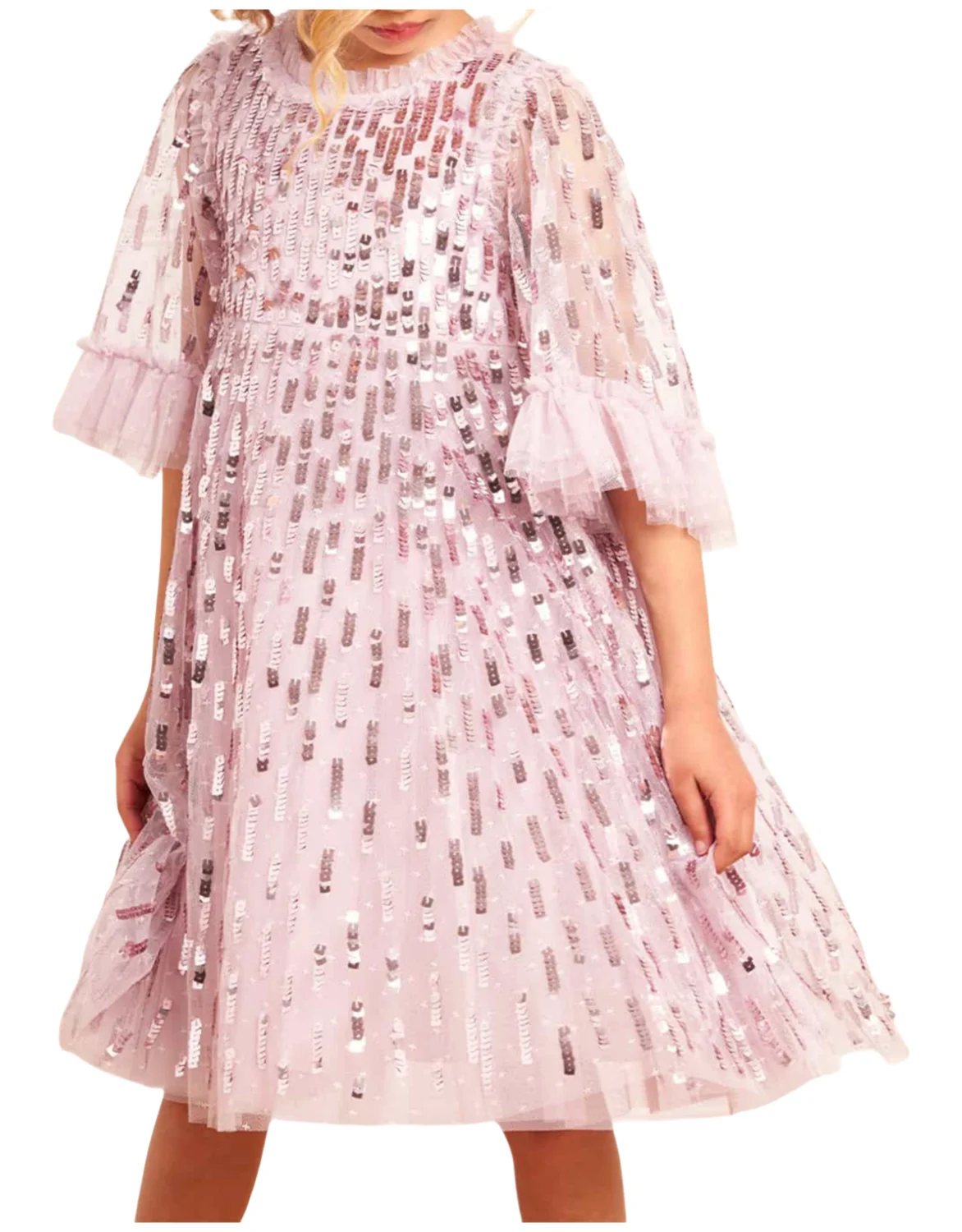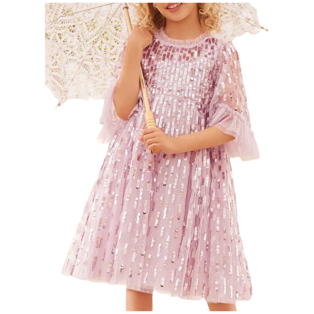 Children's Sweet Pink Sequin Embellished Ruffled Sleeve Evening Dress Girls Kids Fluffy Tulle Princess Gown