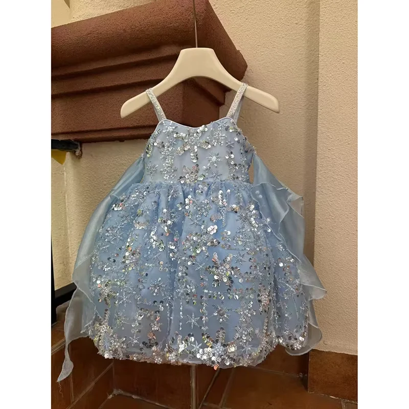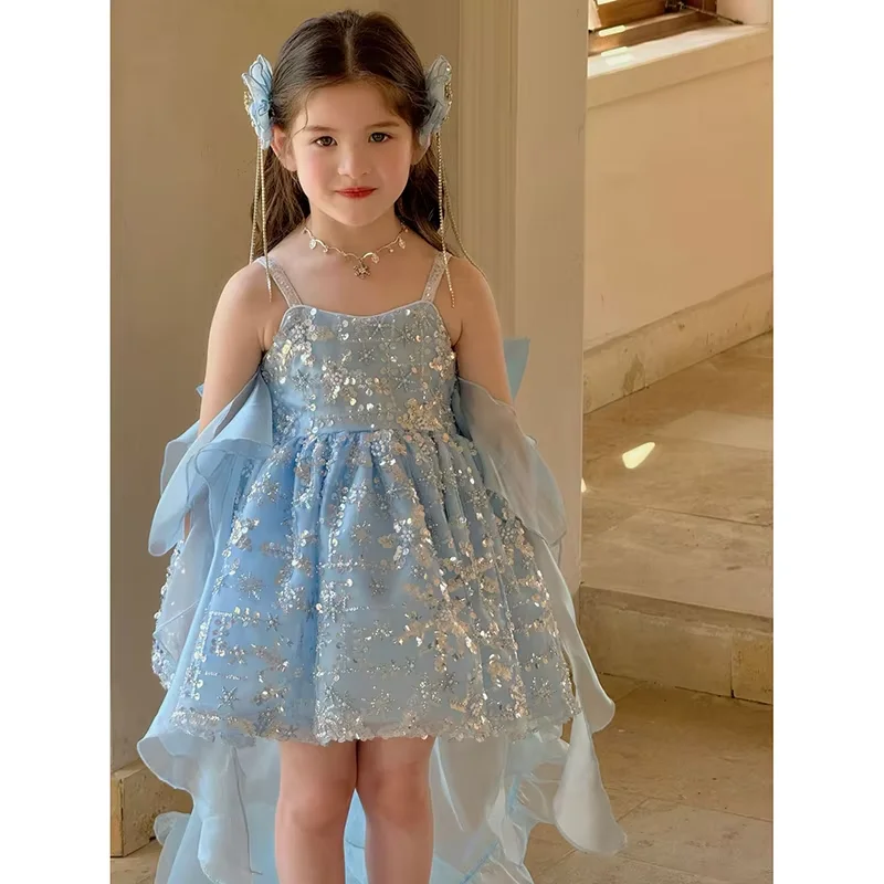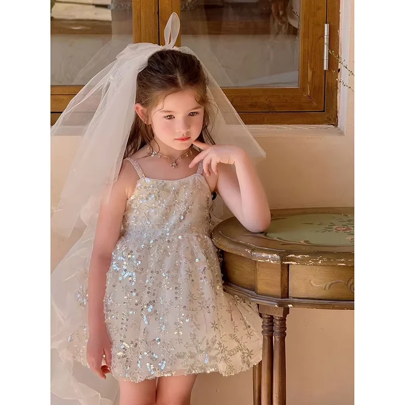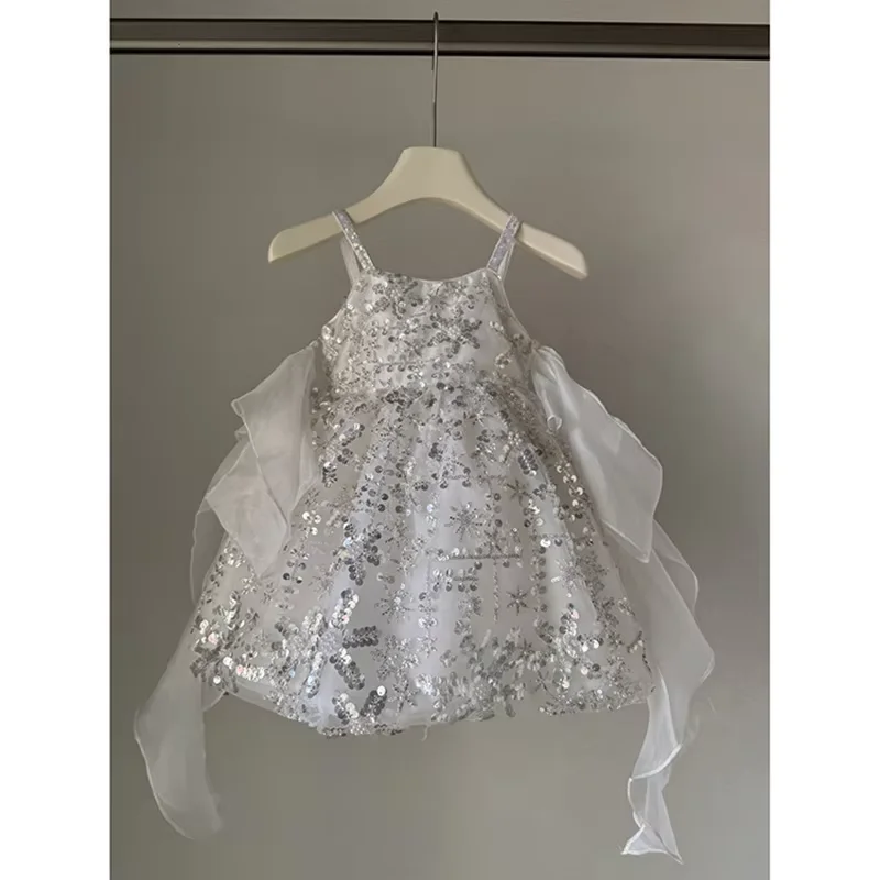 White Princess Dress for Girls Summer Formal Knee-Length Outfit with Puffy Sequins for Stage Party or Birthday ODM for Kids