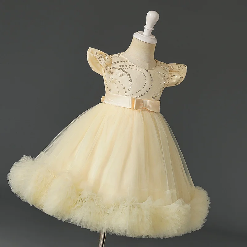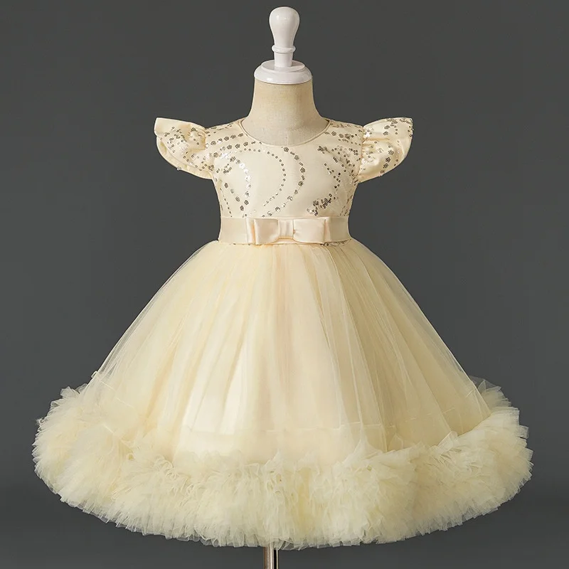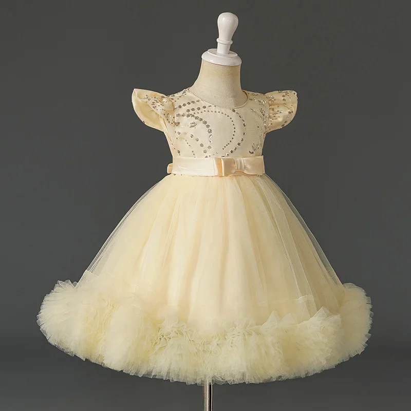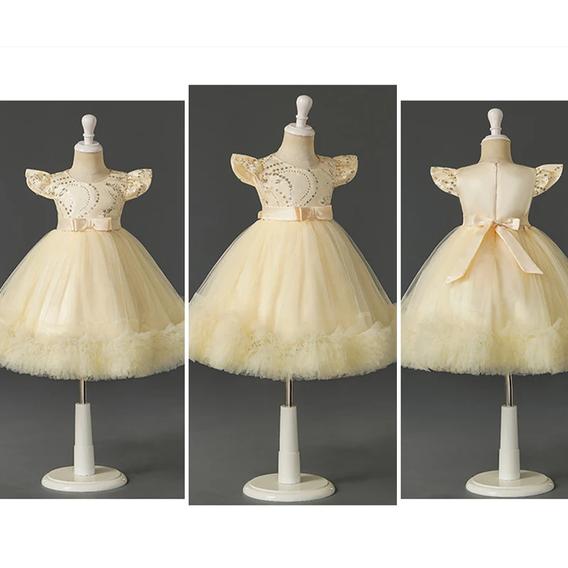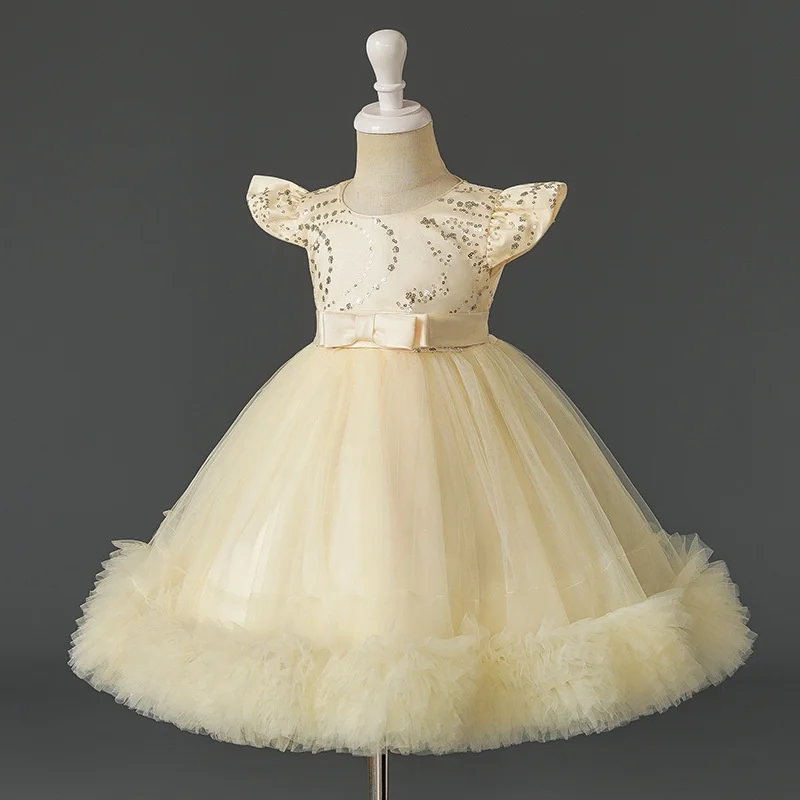 Flying Sleeve Sequins Princess Dress for Girl Bow Embroidery Layering Elegant Dresses for Girls