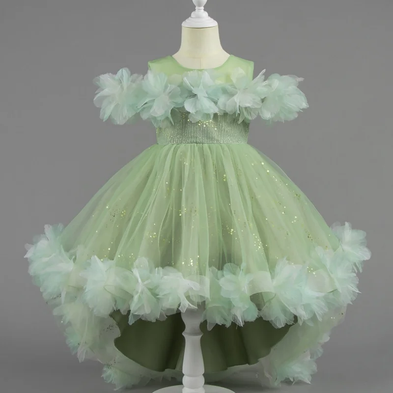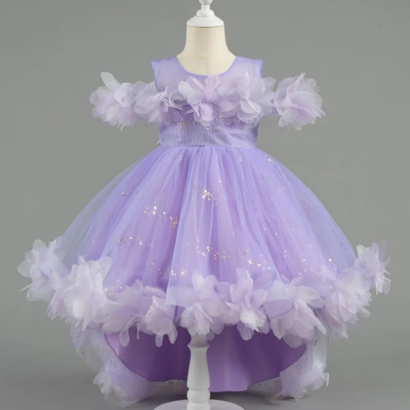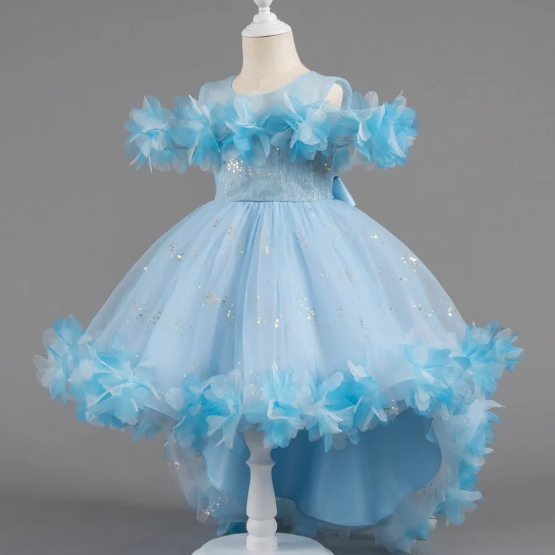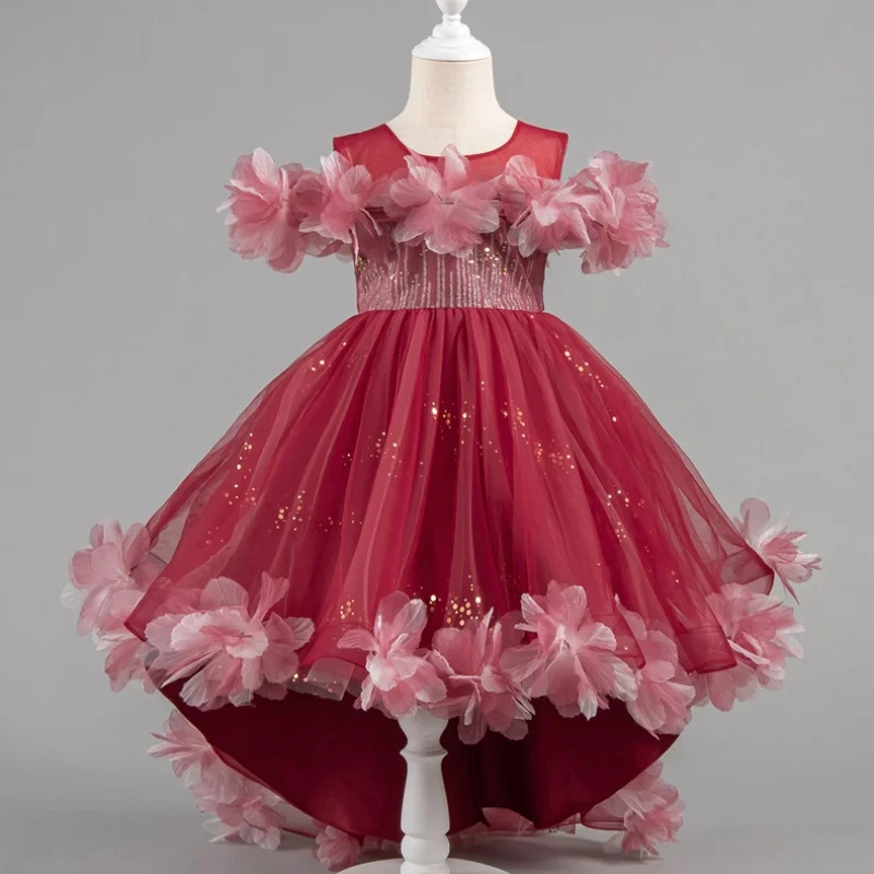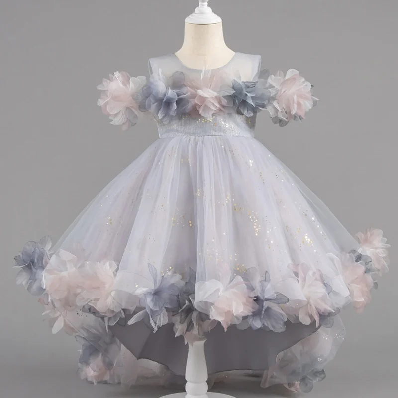Trailing Formal Embroidered Ball Gown Princess Dress for Girls with 3D Flowers and Sequins Layering Birthday Celebration
