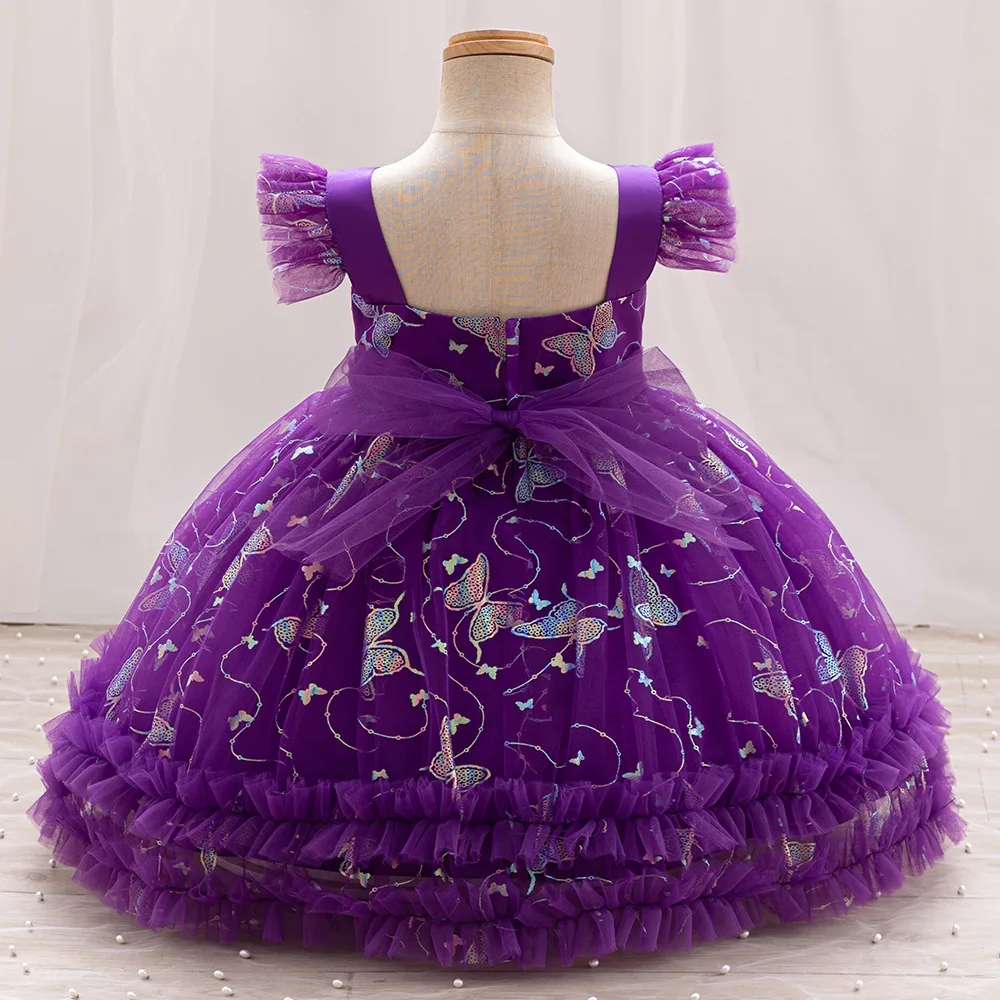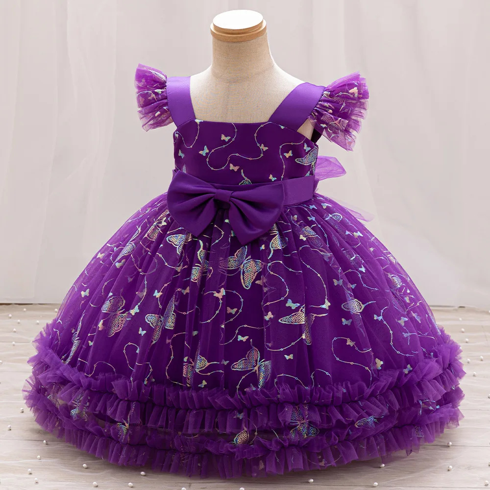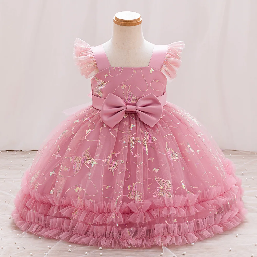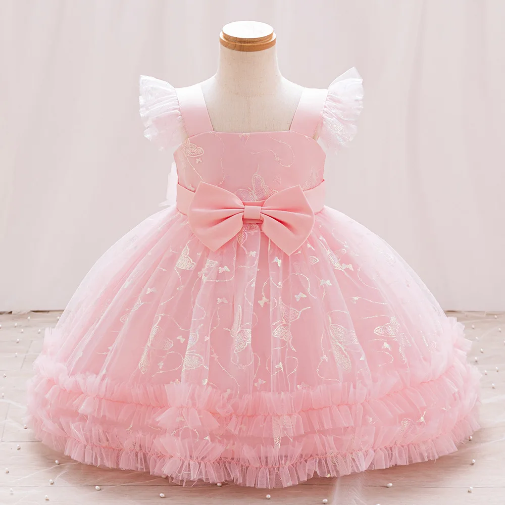 Flying Sleeve Birthday Dresses for Girls Puffy Bow Sequined Embroidery Princess Dress for Girl