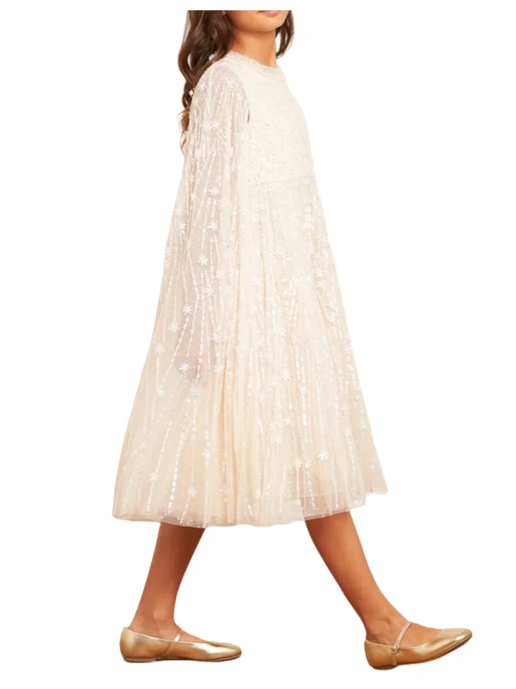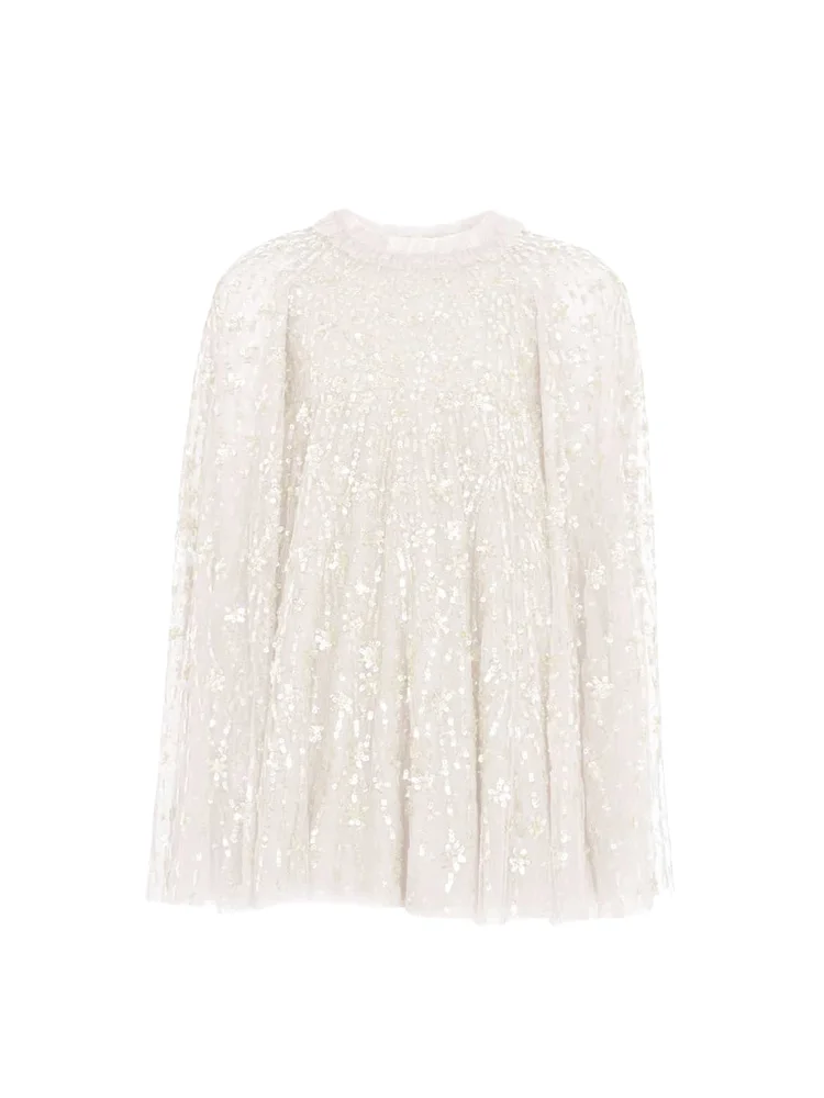 Elegant Children's Sleeveless Knee Length Evening Dress with Cape Girls Kids Sequined Tulle Party Gown