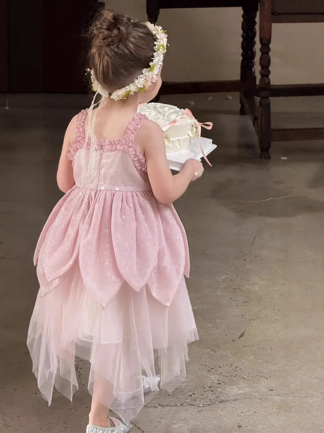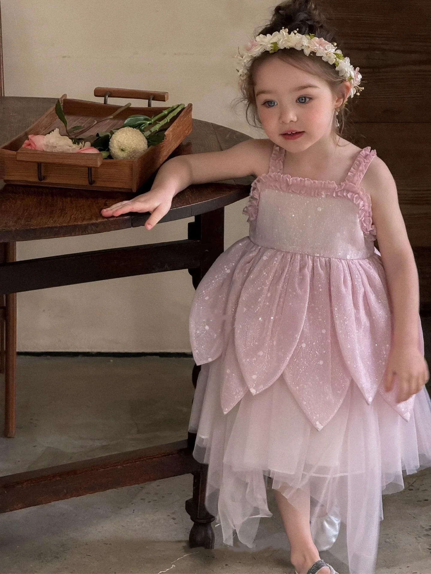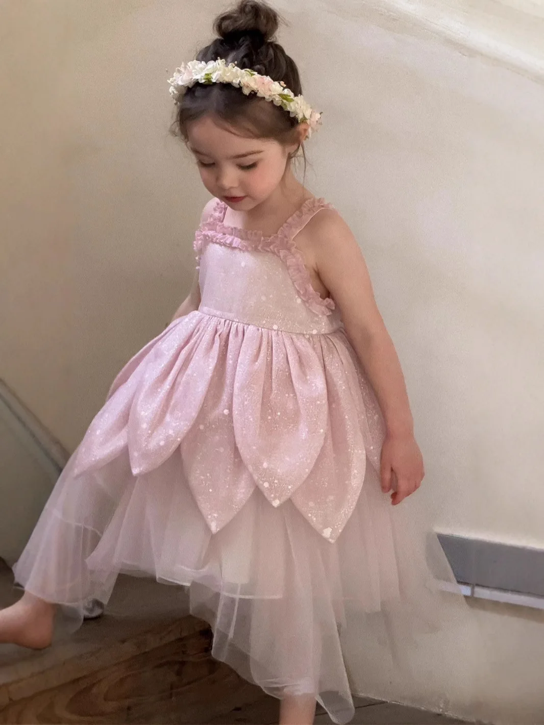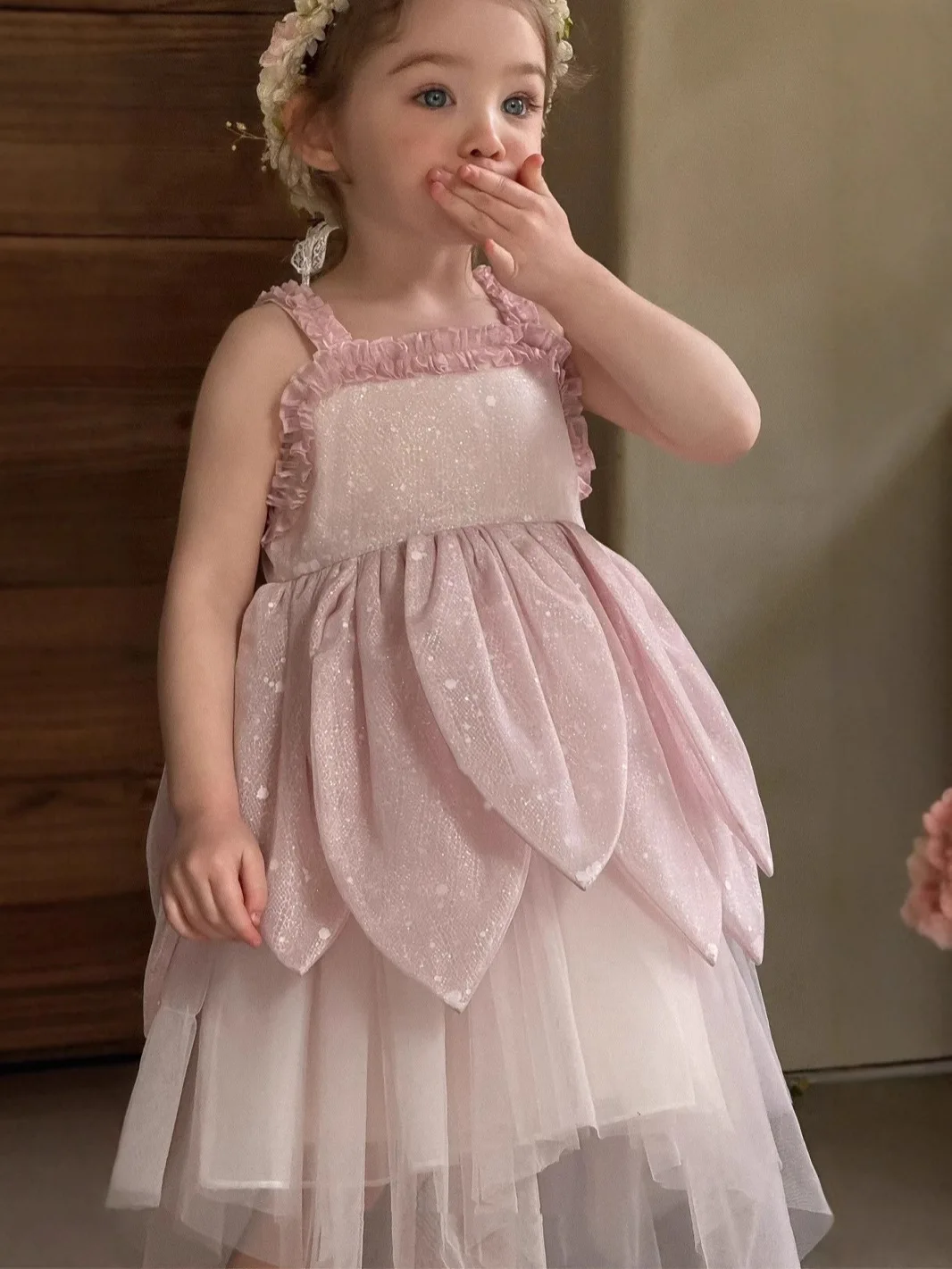 Pink Sequins Halter Top Princess Dress for Girls Embroidered Formal Wedding Layering Mesh Yarn Flower Dress