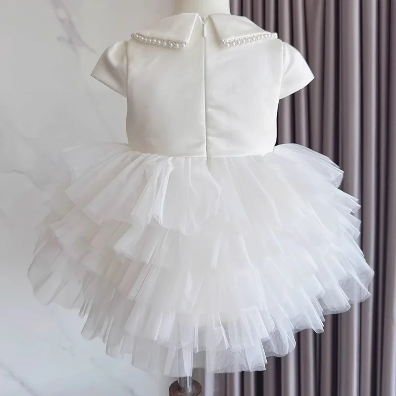 White Ball Gown for Girls Formal Birthday Wedding Dresses with Puffy Mesh Yarn Layering Beaded Collar Elegant Flower Girl Dress