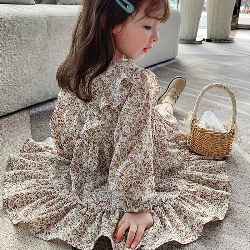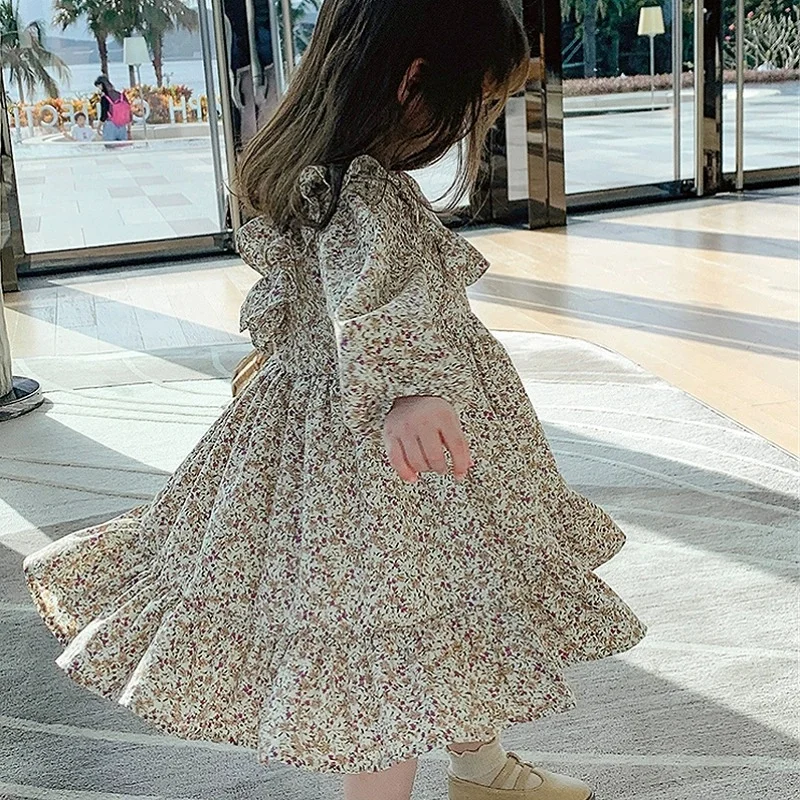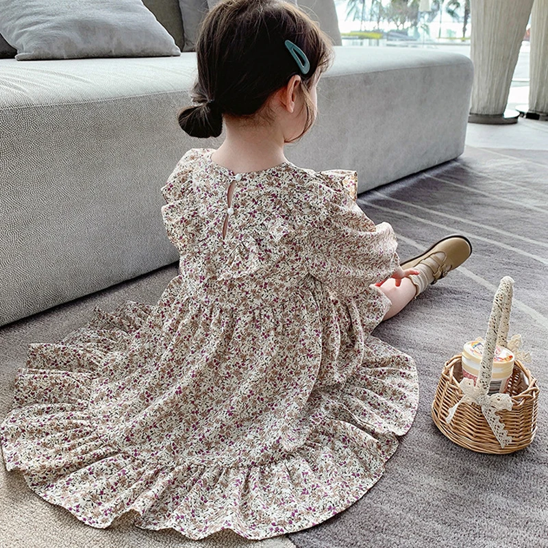 Girls Summer Cotton Linen Pastoral Floral Knee-Length Dress with Frilly Sleeves Children's Casual ODM Clothes