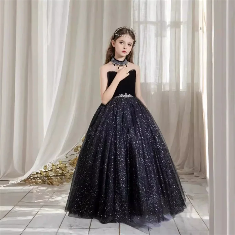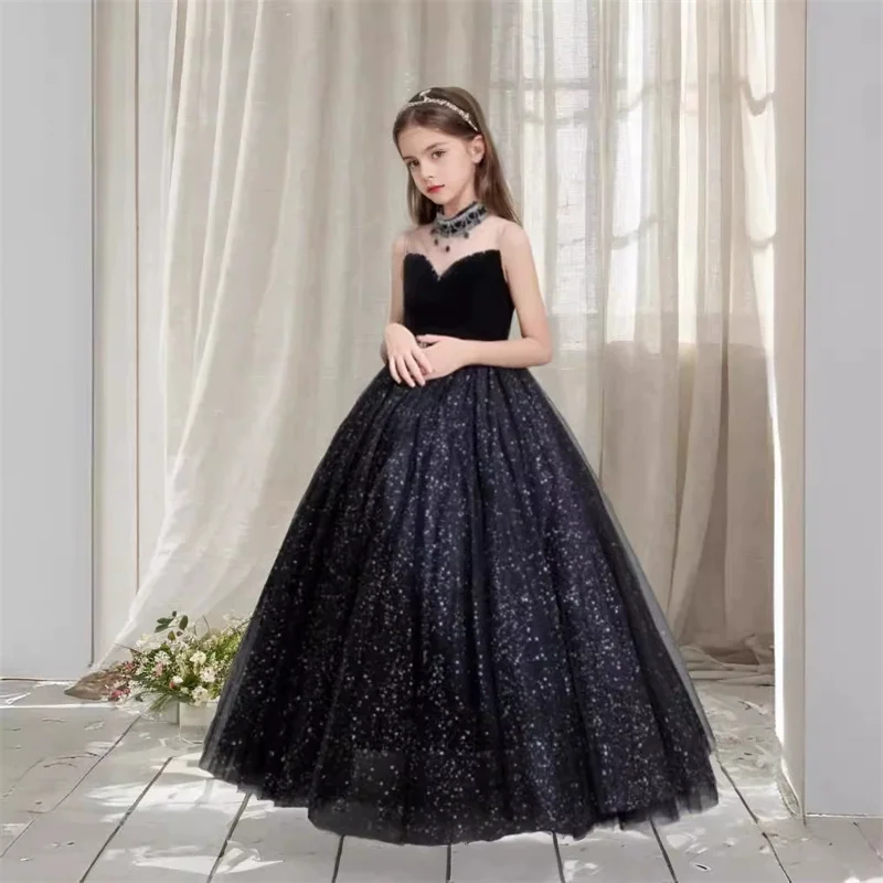 Children's Luxury Sleeveless Girls Evening Dress Embroidered Black Sequin Flower Formal Occasions Princess Dress