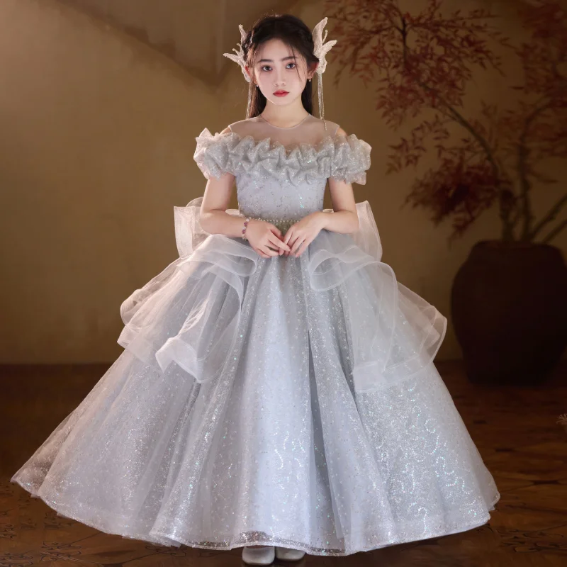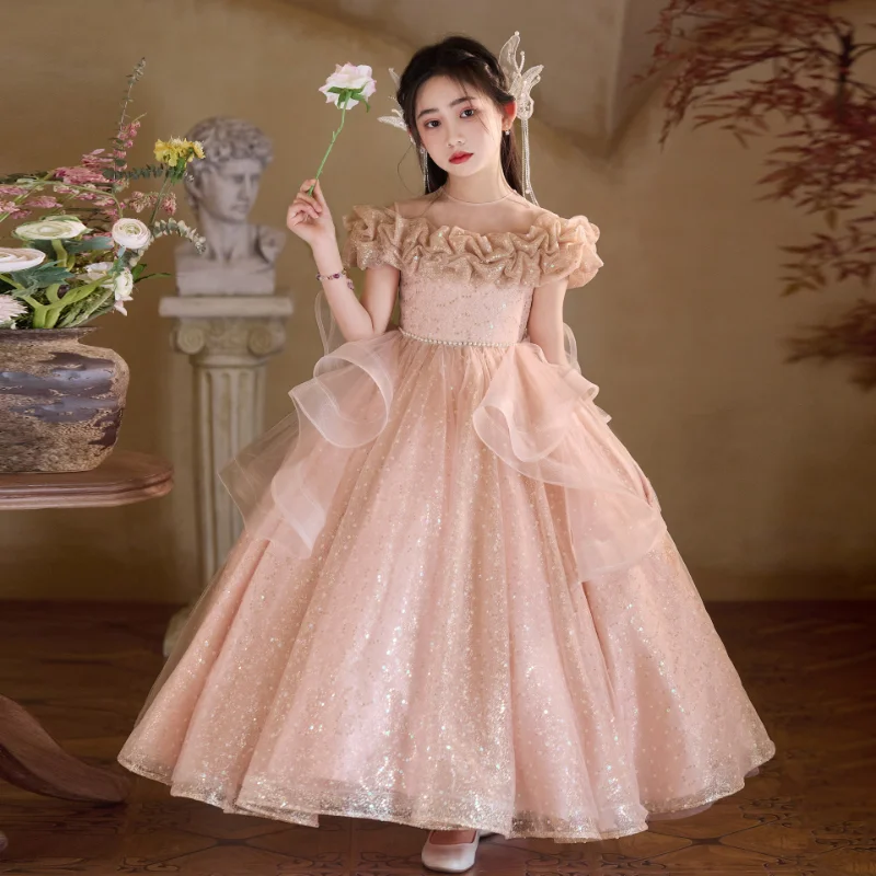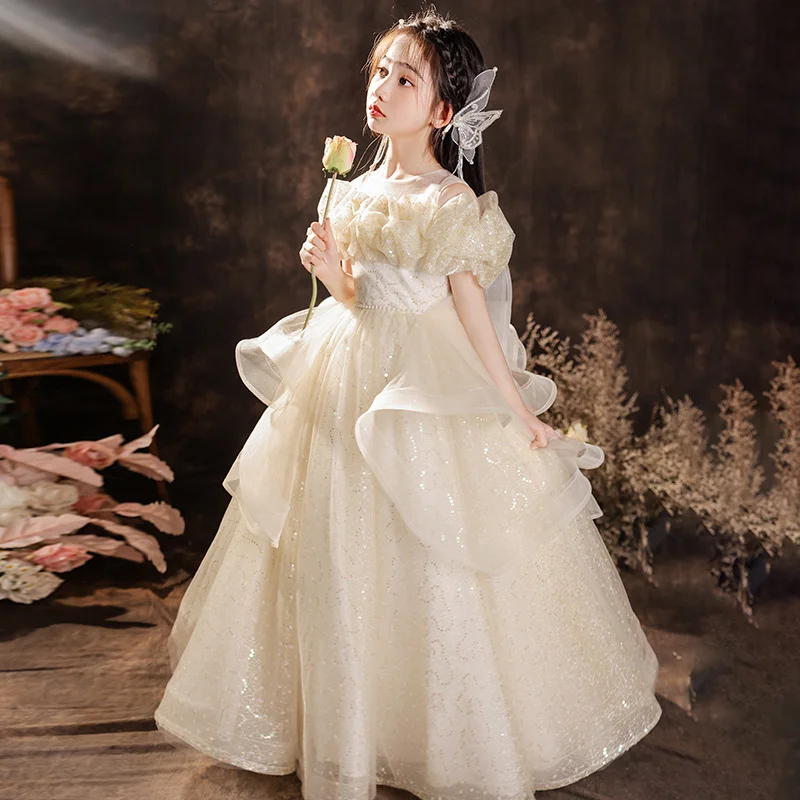 Summer Layering Flower Off Shoulder Girls' Evening Dress Luxury Yellow pink Sequin Stage Birthday Party Princess Dress