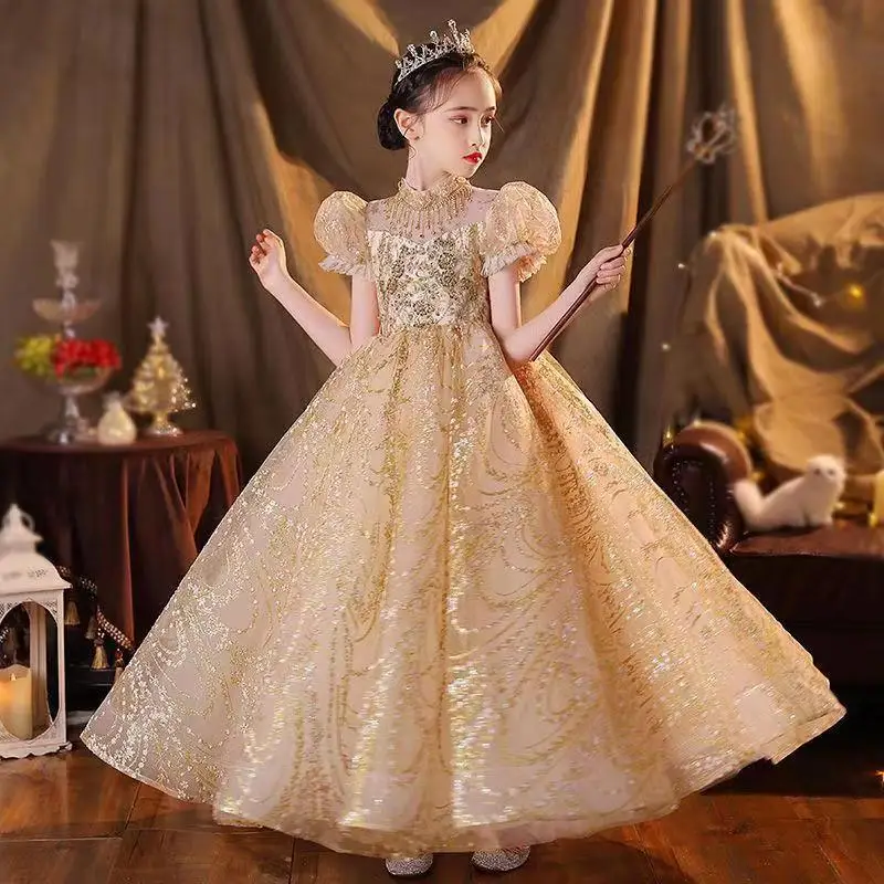 ODM Supply Luxury Sequin Evening Party Dress for Girls Children's Princess Piano Performance Dress with Ruffles Decoration