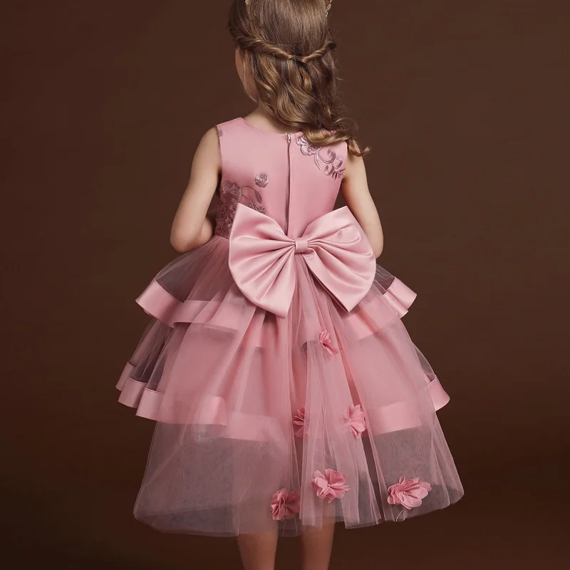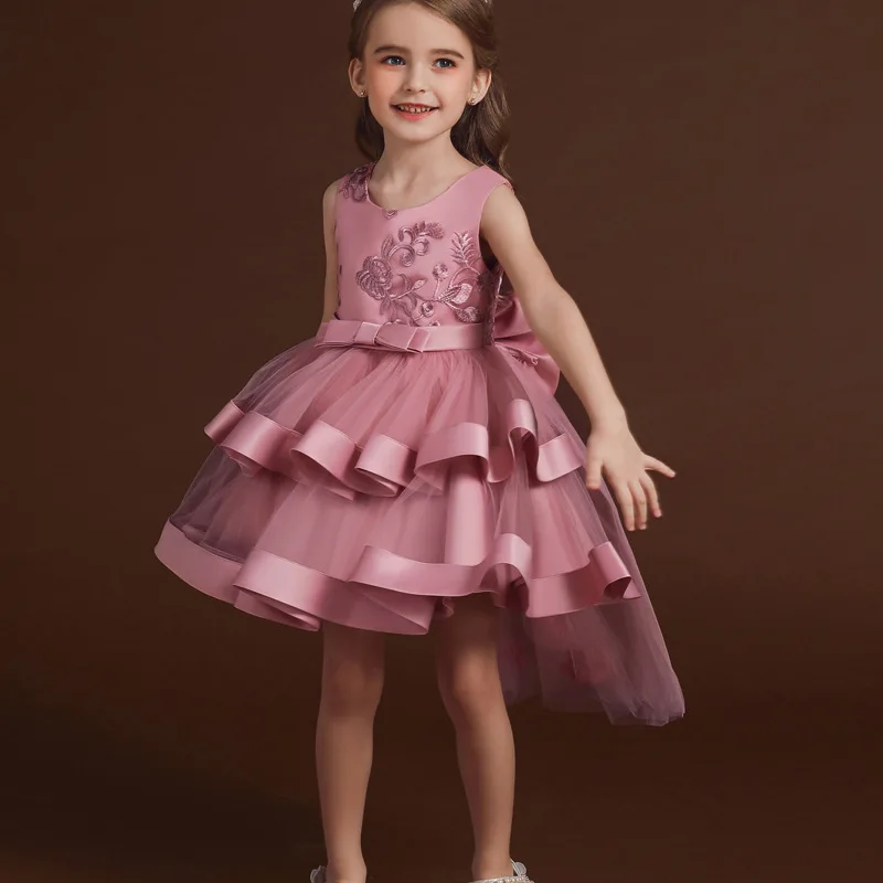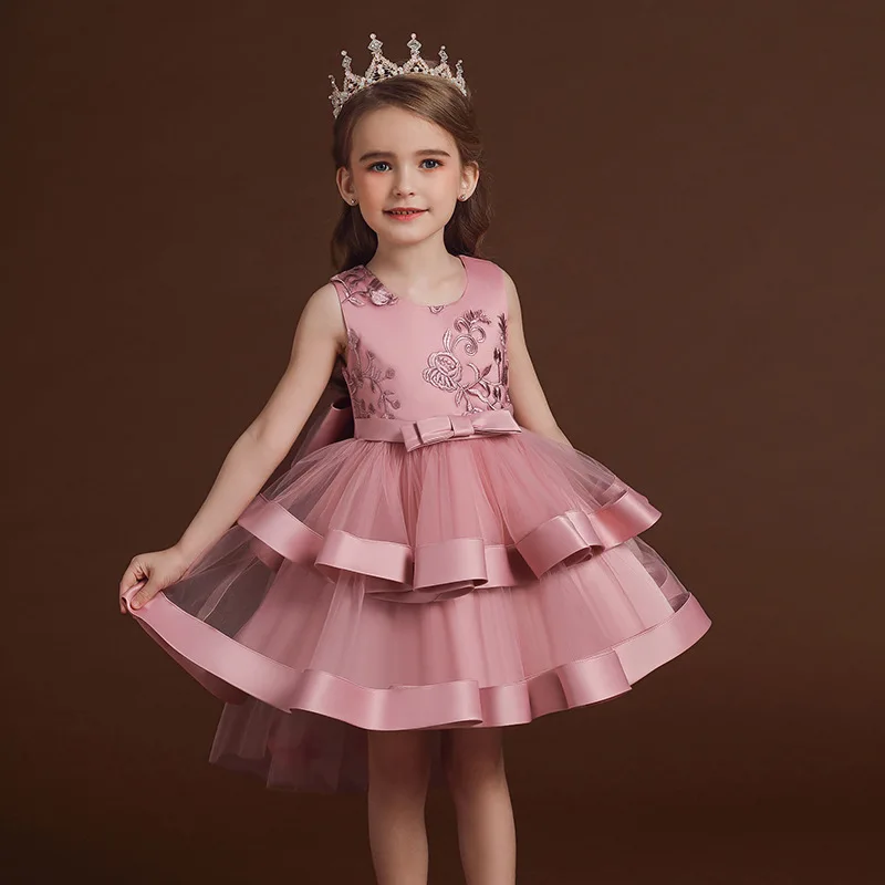 Wholesale Kids Party Sleeveless Tiered Evening Dresses Elegance Embroidery Lace Bow Girls Princess Dress