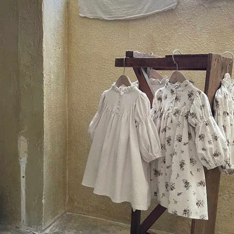 Wholesale Casual Solid Children's Breathable Cotton/Linen Fashion Skirt Kids Girls Long Sleeve Clothes Toddler Cute Baby Dresses