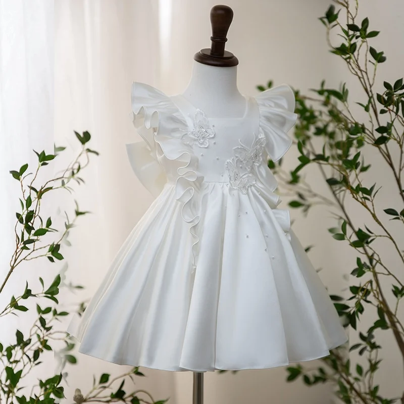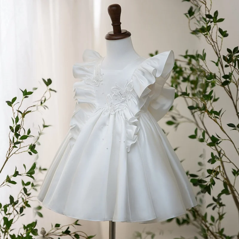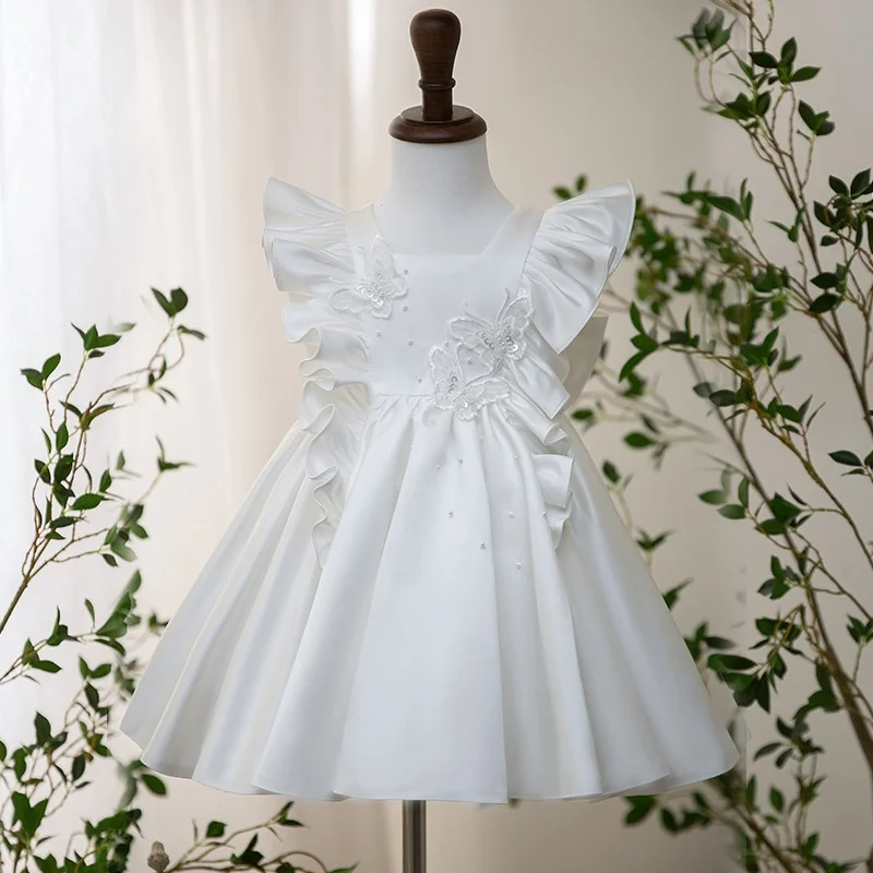 White Bow Formal Princess Ball Gown Dress for Girls with Embroidered Butterfly Style and Sleeveless Design