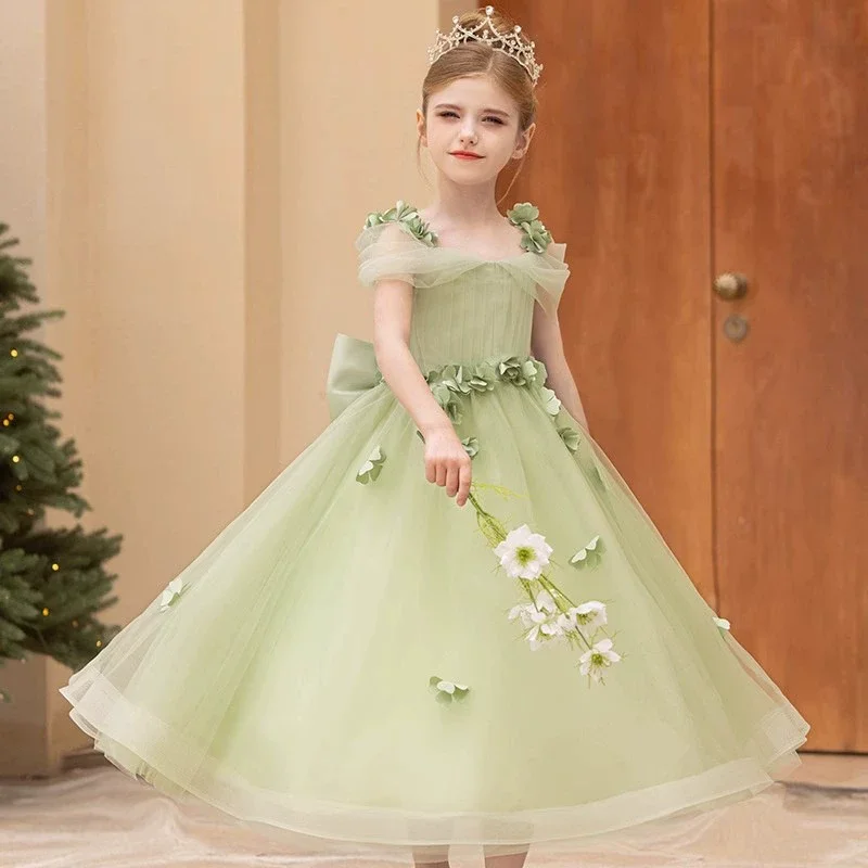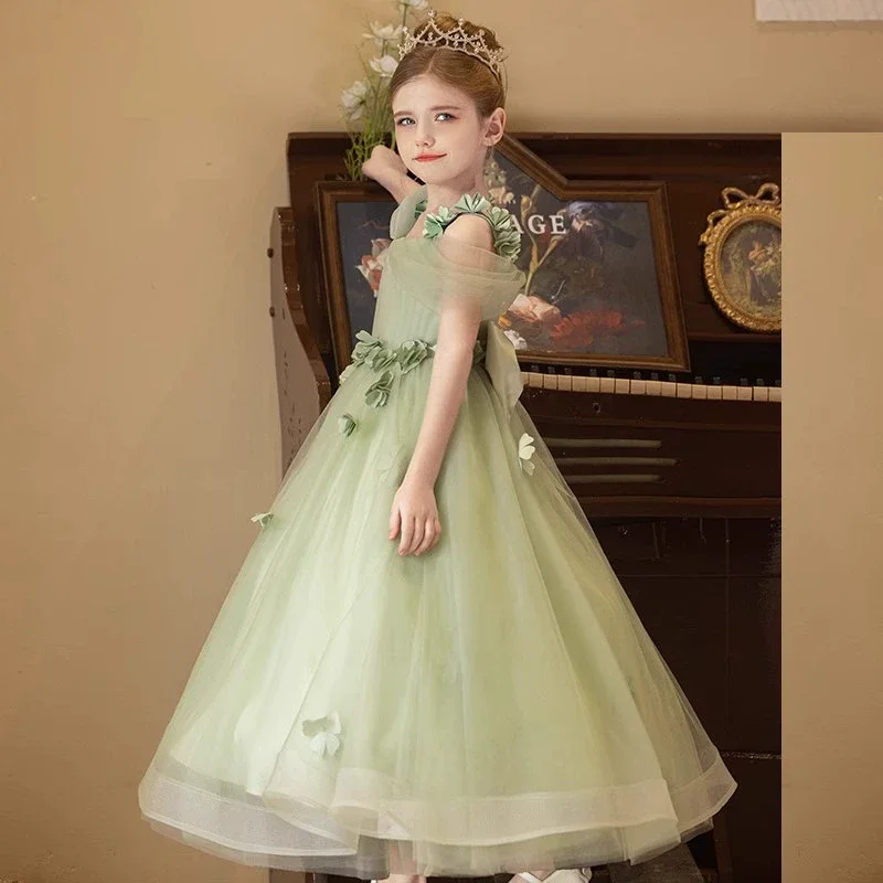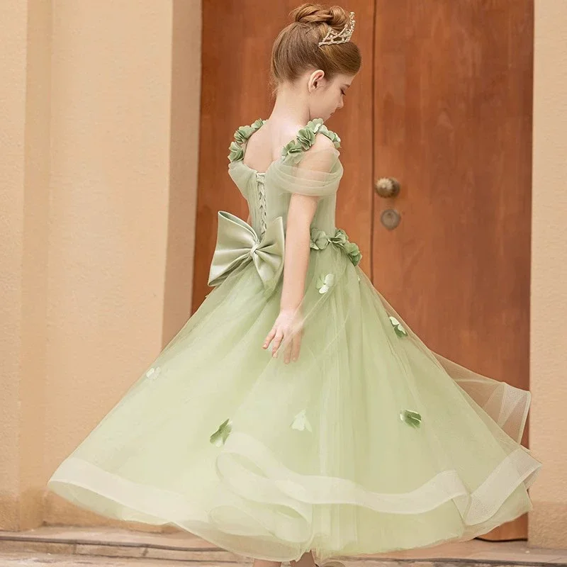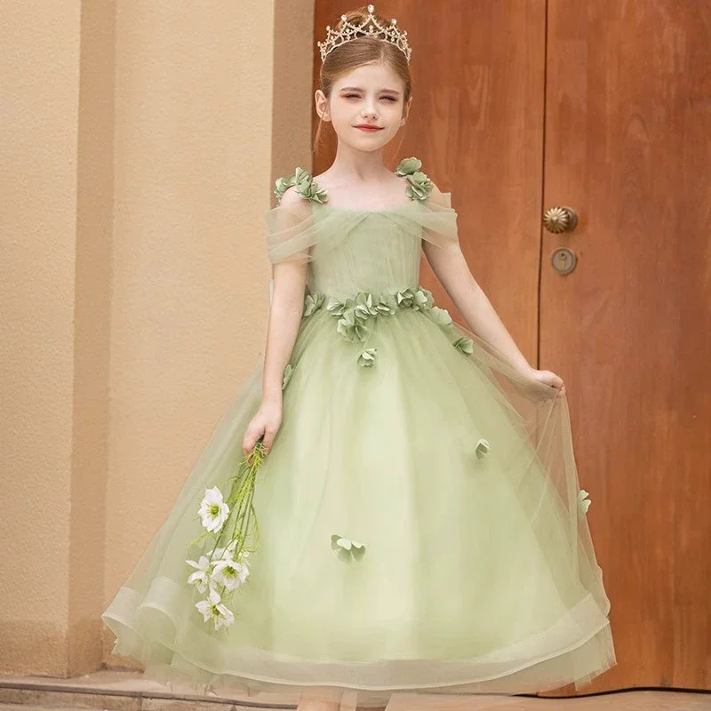Green Summer Formal Long Kids Princess Dress Forest Style Tulle Fairy Embroidered Flower Decoration Girls' Evening Dress