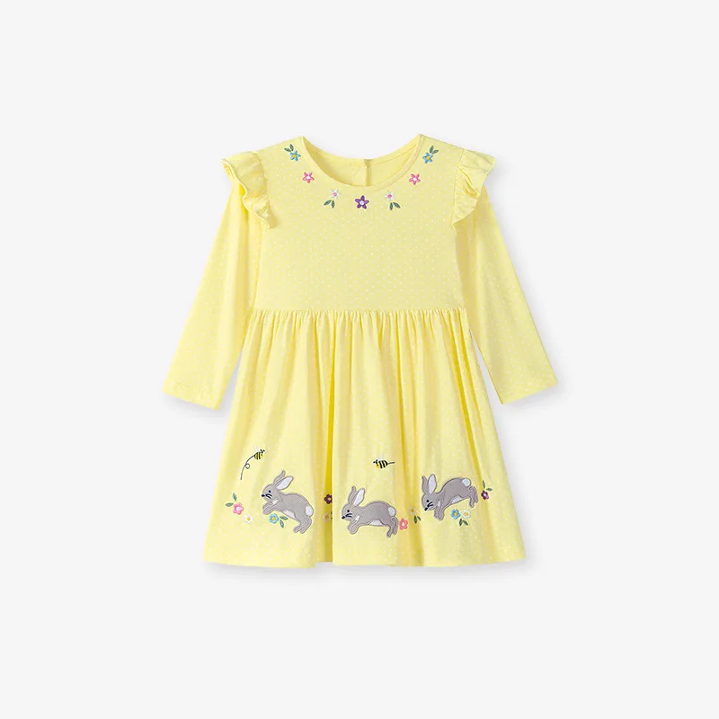 Autumn European American Style Kids Girls Dress Long Ruffles Sleeves Cartoon Flower Embroidery Cute O-neck Children's Dresses