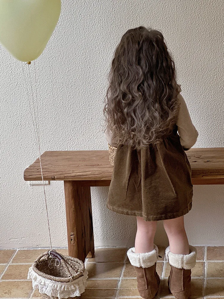 Autumn New Korean Version Girls' Casual Plaid Dress Bear Embroidery Long Sleeve Princess Dress Wooden Ear Lace Dress for Kids