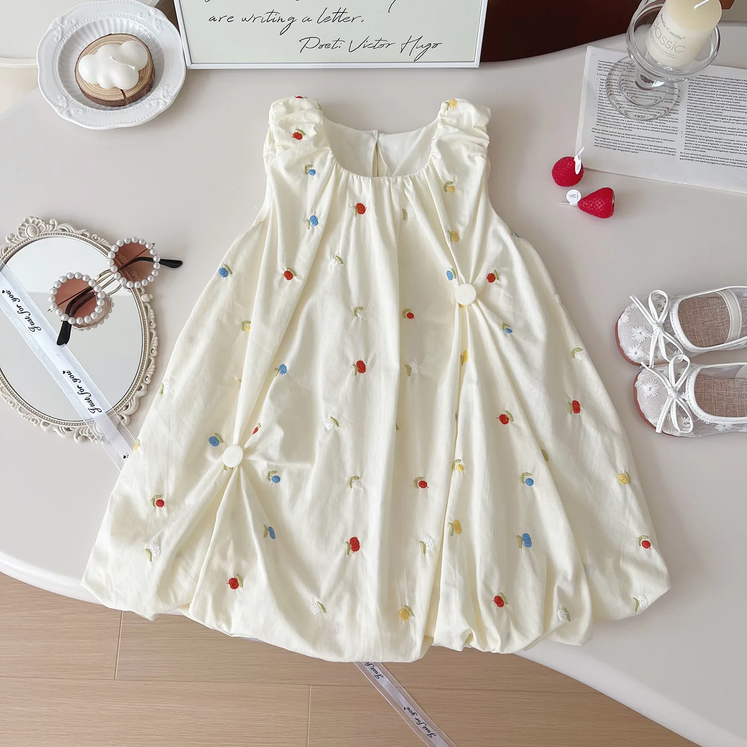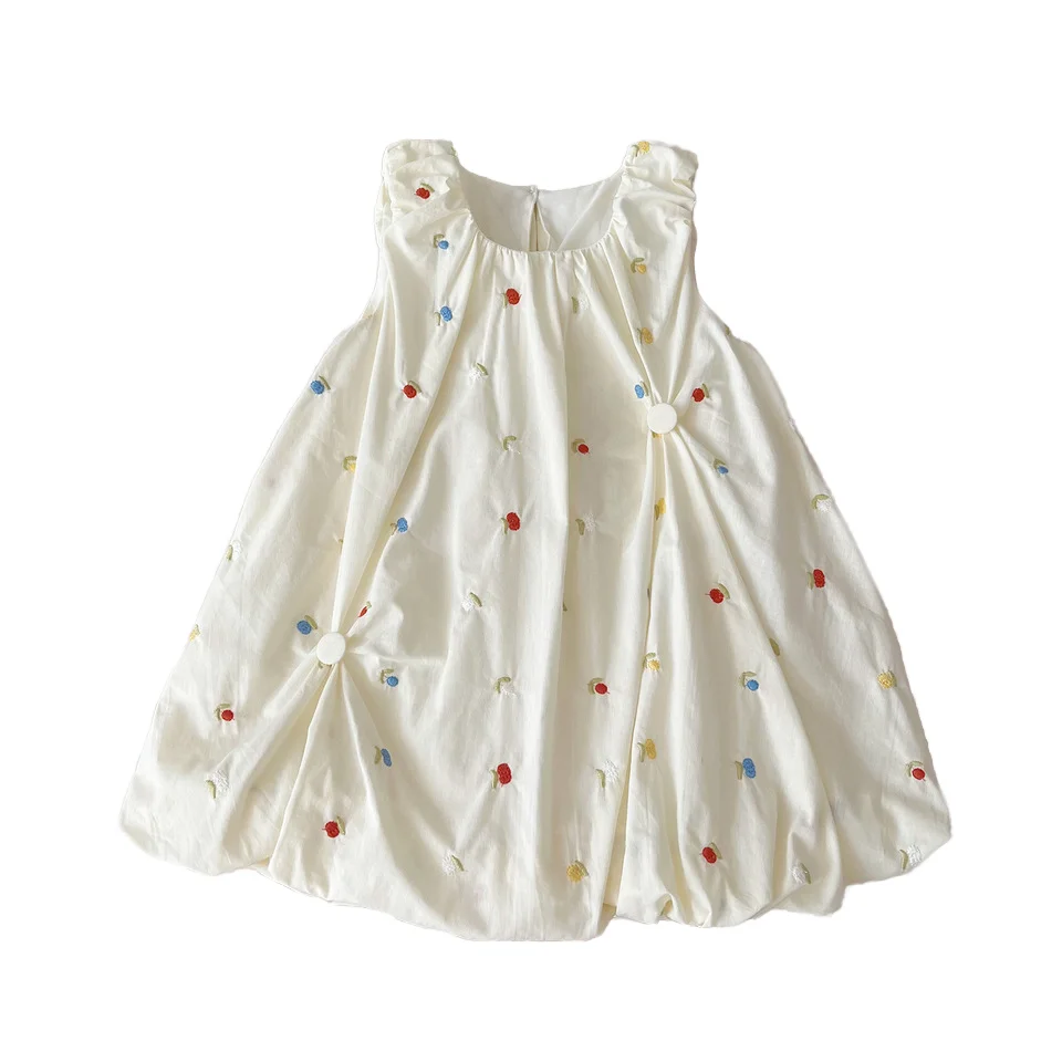 Elegant A-Line Princess Dress for Girls Summer Children's Sleeveless Skirt with 3D Summer Flower Embroidery Knee-Length