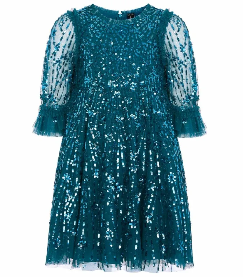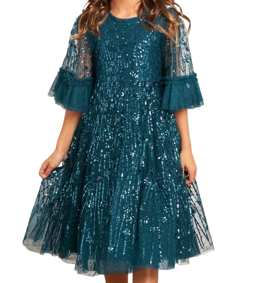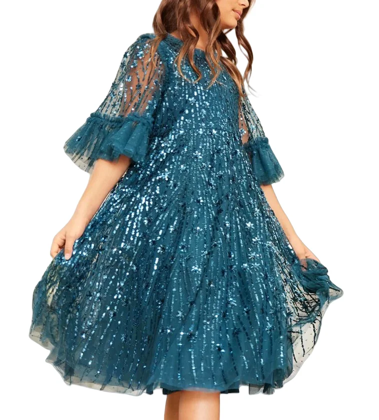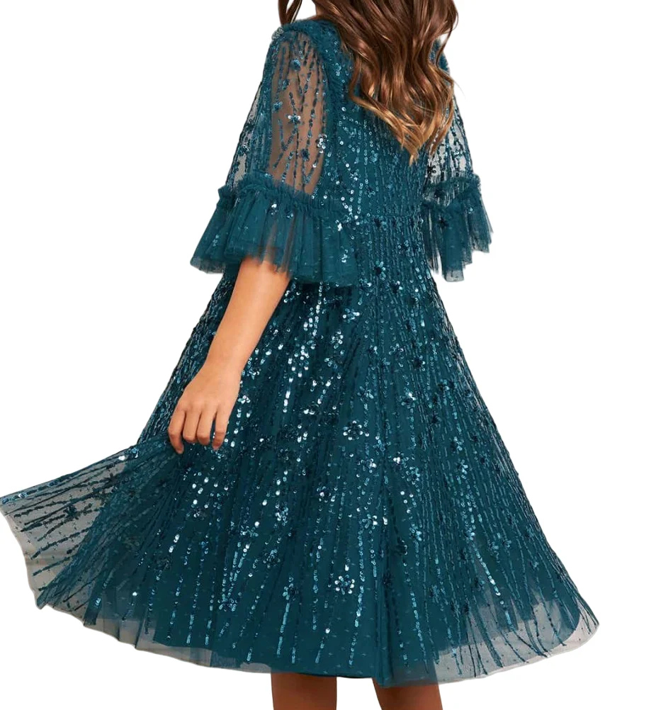 Girls Knee Length O-Neck Sequin Evening Dress Kids Fluffy Tulle Layered Half Sleeve Party Gown