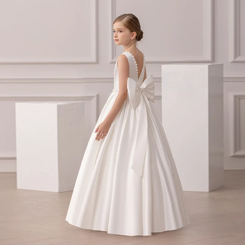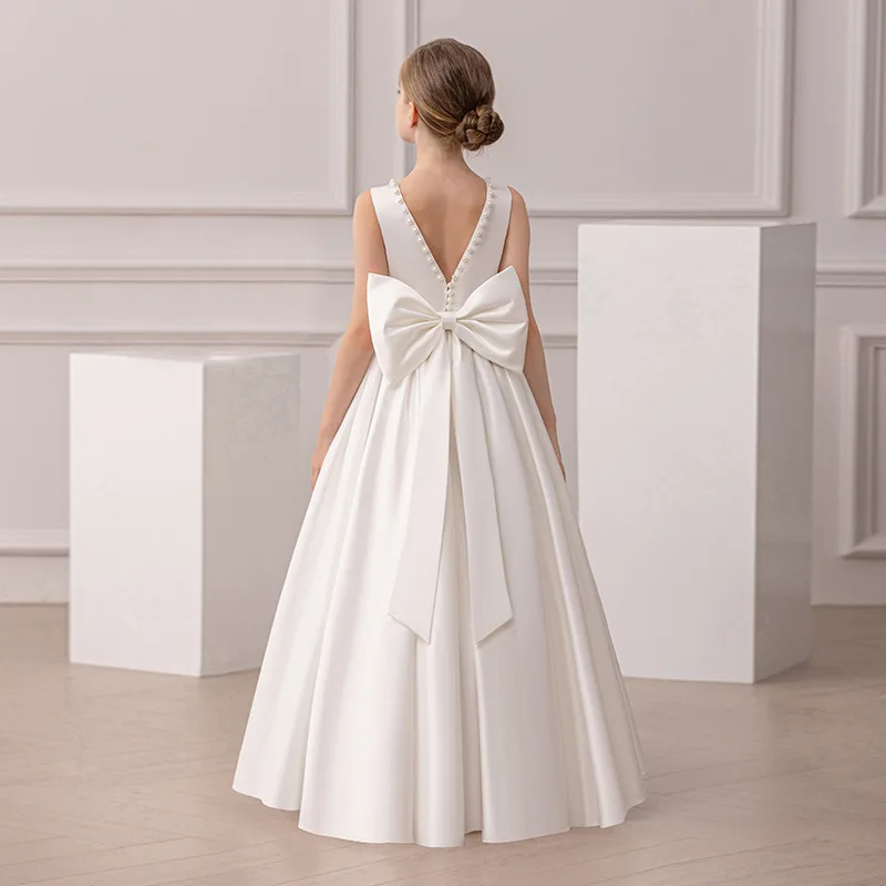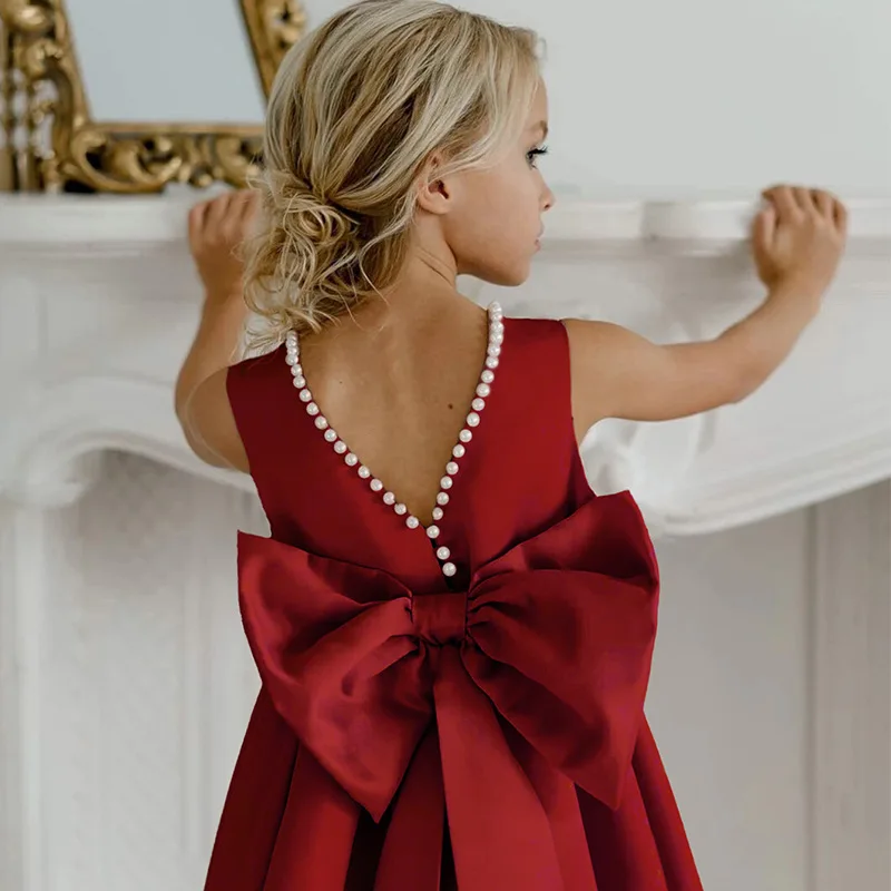 Red Satin V-back Big Bow Princess Children Birthday Flower Girls Dress Classical Floor Length Elegant Satin Party Dresses